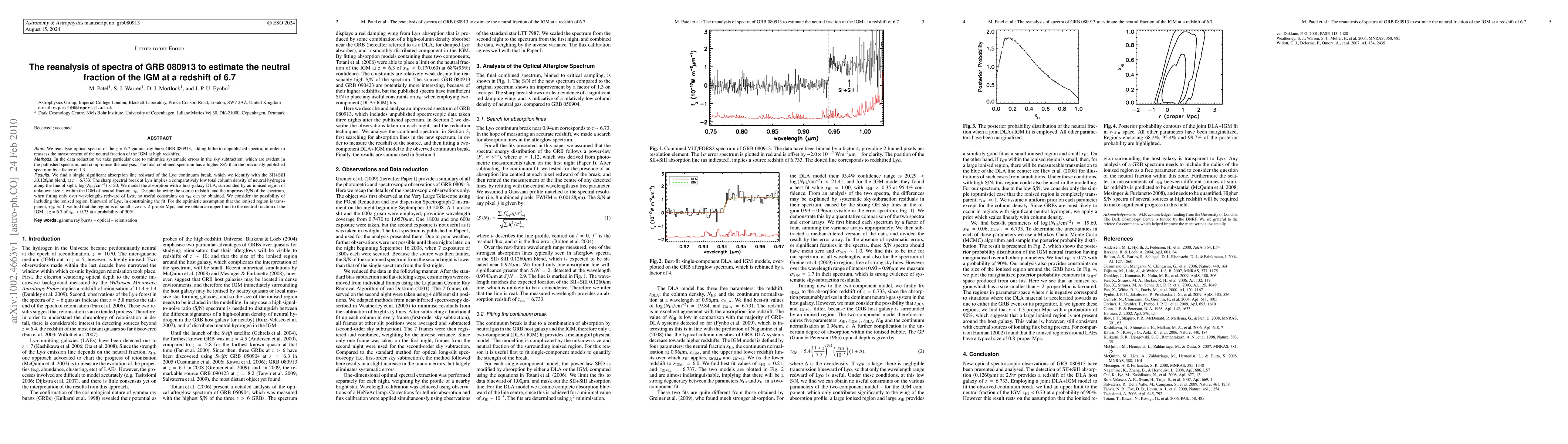 This paper reanalyzes the optical spectra of GRB 080913 at z=6.7 to reassess the neutral hydrogen fraction in the IGM, finding a low neutral hydrogen column density. An upper limit of x(HI) < 0.73 for the IGM neutral fraction is obtained, assuming a small, transparent ionised region.