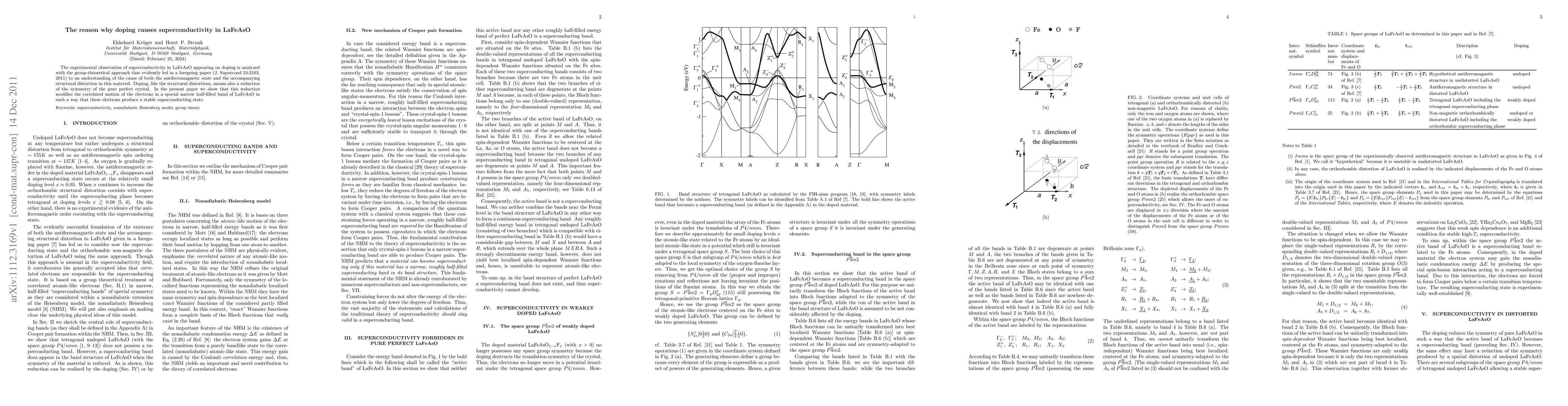 This paper uses a group-theoretical approach to explain how doping induces superconductivity in LaFeAsO by reducing the symmetry of the crystal, which modifies the correlated electron motion in a specific narrow band, leading to a stable superconducting state. The analysis builds on previous findings that connect doping to structural distortions and antiferromagnetic states.