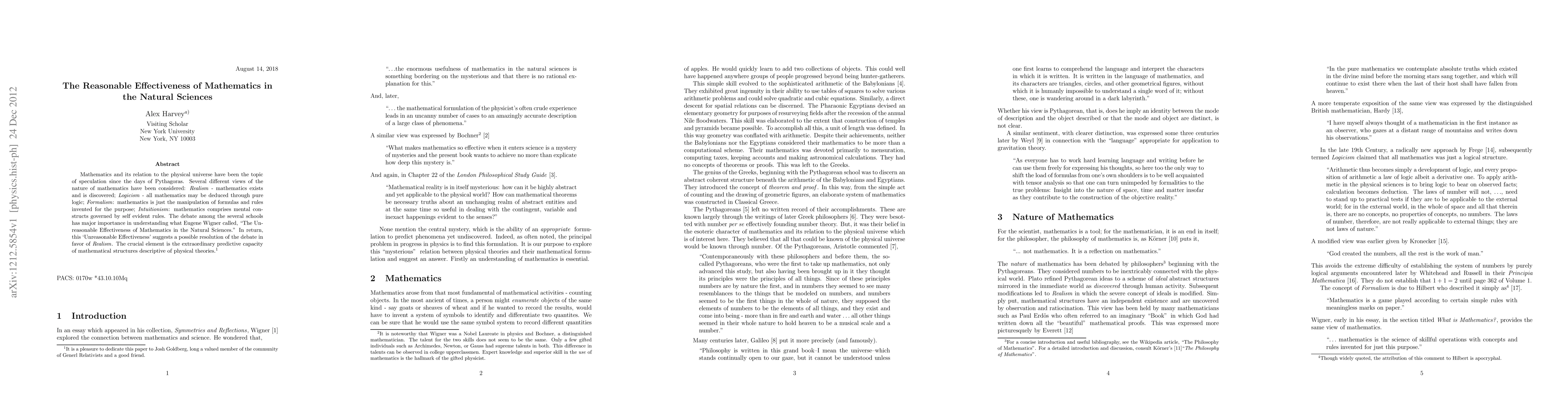 Mathematics and its relation to the physical universe have been the topic of speculation since the days of Pythagoras. Several different views of the nature of mathematics have been considered: Realism - mathematics exists and is discovered; Logicism - all mathematics may be deduced through pure logic; Formalism - mathematics is just the manipulation of formulas and rules invented for the purpose; Intuitionism - mathematics comprises mental constructs governed by self evident rules. The debate among the several schools has major importance in understanding what Eugene Wigner called, "The Unreasonable Effectiveness of Mathematics in the Natural Sciences." In return, this `Unreasonable Effectiveness' suggests a possible resolution of the debate in favor of it Realism. The crucial element is the extraordinary predictive capacity of mathematical structures descriptive of physical theories.