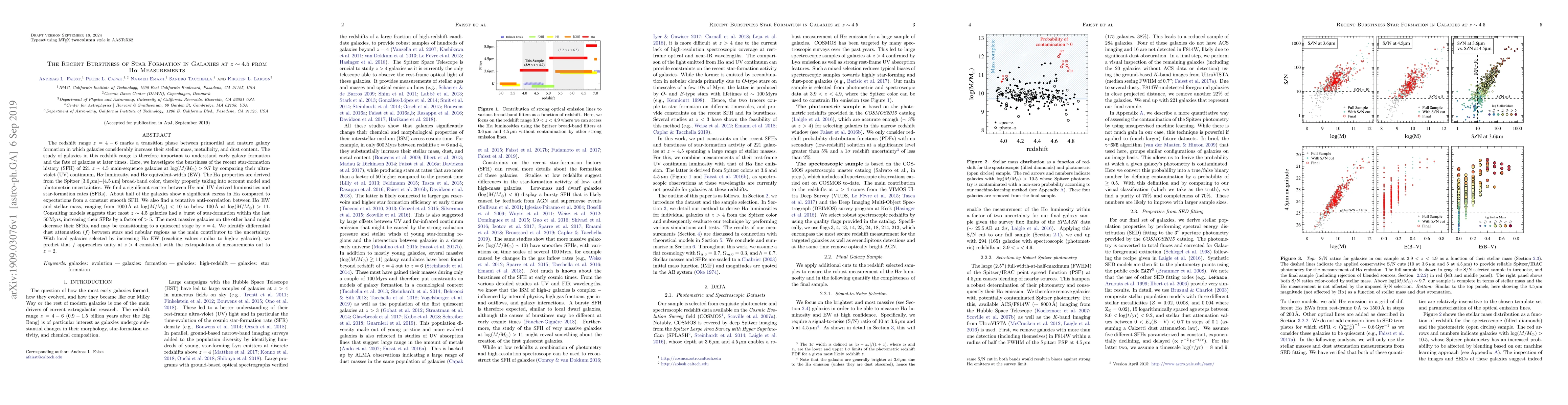 The redshift range z=4-6 marks a transition phase between primordial and mature galaxy formation in which galaxies considerably increase their stellar mass, metallicity, and dust content. The study of galaxies in this redshift range is therefore important to understand early galaxy formation and the fate of galaxies at later times. Here, we investigate the burstiness of the recent star-formation history (SFH) of 221 $z\sim4.5$ main-sequence galaxies at log(M) > 9.7 by comparing their ultra-violet (UV) continuum, H$\alpha$ luminosity, and H$\alpha$ equivalent-width (EW). The H$\alpha$ properties are derived from the Spitzer [3.6$\mu$m]-[4.5$\mu$m] broad-band color, thereby properly taking into account model and photometric uncertainties. We find a significant scatter between H$\alpha$ and UV-derived luminosities and star-formation rates (SFRs). About half of the galaxies show a significant excess in H$\alpha$ compared to expectations from a constant smooth SFH. We also find a tentative anti-correlation between H$\alpha$ EW and stellar mass, ranging from 1000$\r{A}$ at log(M) < 10 to below 100$\r{A}$ at log(M) > 11. Consulting models suggests that most $z\sim4.5$ galaxies had a burst of star-formation within the last 50 Myrs, increasing their SFRs by a factor of > 5. The most massive galaxies on the other hand might decrease their SFRs, and may be transitioning to a quiescent stage by z=4. We identify differential dust attenuation (f) between stars and nebular regions as the main contributor to the uncertainty. With local galaxies selected by increasing H$\alpha$ EW (reaching values similar to high-z galaxies), we predict that f approaches unity at $z>4$ consistent with the extrapolation of measurements out to z=2.