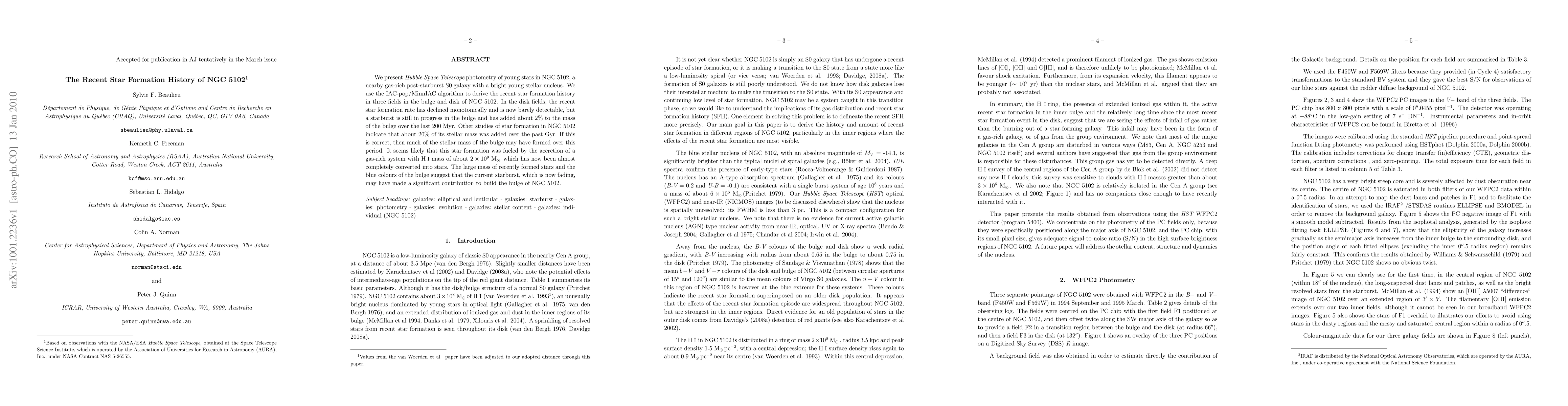 This study uses Hubble Space Telescope data to analyze the recent star formation history in NGC 5102, revealing a declining star formation rate in the disk and an ongoing starburst in the bulge that has added about 2% to the bulge's mass over the last 200 Myr. The findings suggest that much of the bulge's stellar mass may have formed over the past Gyr, likely fueled by the accretion of a gas-rich system.