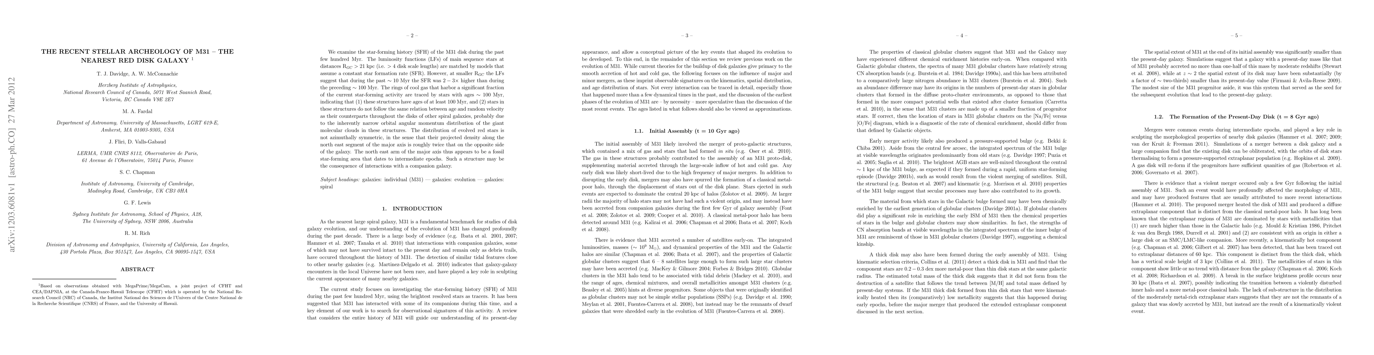 We examine the star-forming history (SFH) of the M31 disk during the past few hundred Myr. The luminosity functions (LFs) of main sequence stars at distances R_GC > 21 kpc (i.e. > 4 disk scale lengths) are matched by models that assume a constant star formation rate (SFR). However, at smaller R_GC the LFs suggest that during the past ~10 Myr the SFR was 2 - 3 times higher than during the preceding ~100 Myr. The rings of cool gas that harbor a significant fraction of the current star-forming activity are traced by stars with ages ~100 Myr, indicating that (1) these structures have ages of at least 100 Myr, and (2) stars in these structures do not follow the same relation between age and random velocity as their counterparts throughout the disks of other spiral galaxies, probably due to the inherently narrow orbital angular momentum distribution of the giant molecular clouds in these structures. The distribution of evolved red stars is not azimuthally symmetric, in the sense that their projected density along the north east segment of the major axis is roughly twice that on the opposite side of the galaxy. The north east arm of the major axis thus appears to be a fossil star-forming area that dates to intermediate epochs. Such a structure may be the consequence of interactions with a companion galaxy.