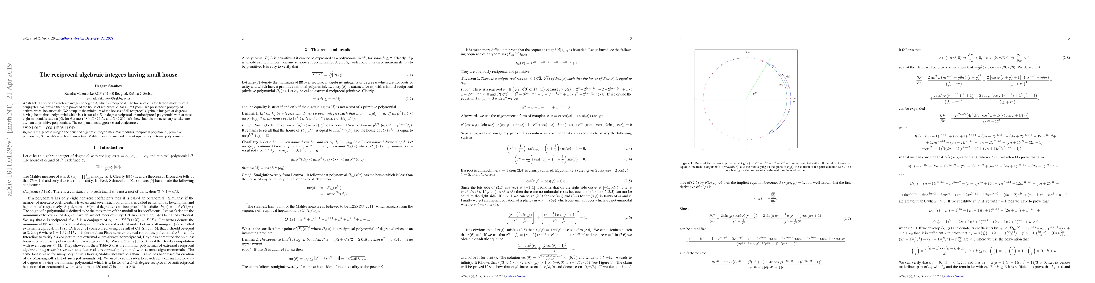 Let $\alpha$ be an algebraic integer of degree $d$, which is reciprocal. The house of $\alpha$ is the largest modulus of its conjugates. We proved that $d$-th power of the house of reciprocal $\alpha$ has a limit point. We presented a property of antireciprocal hexanomials. We compute the minimum of the houses of all reciprocal algebraic integers of degree $d$ having the minimal polynomial which is a factor of a $D$-th degree reciprocal or antireciprocal polynomial with at most eight monomials, say $\mathrm{mr}(d)$, for $d$ at most 180, $D\le 1.5d$ and $D\le 210$. We show that it is not necessary to take into account unprimitive polynomials. The computations suggest several conjectures.