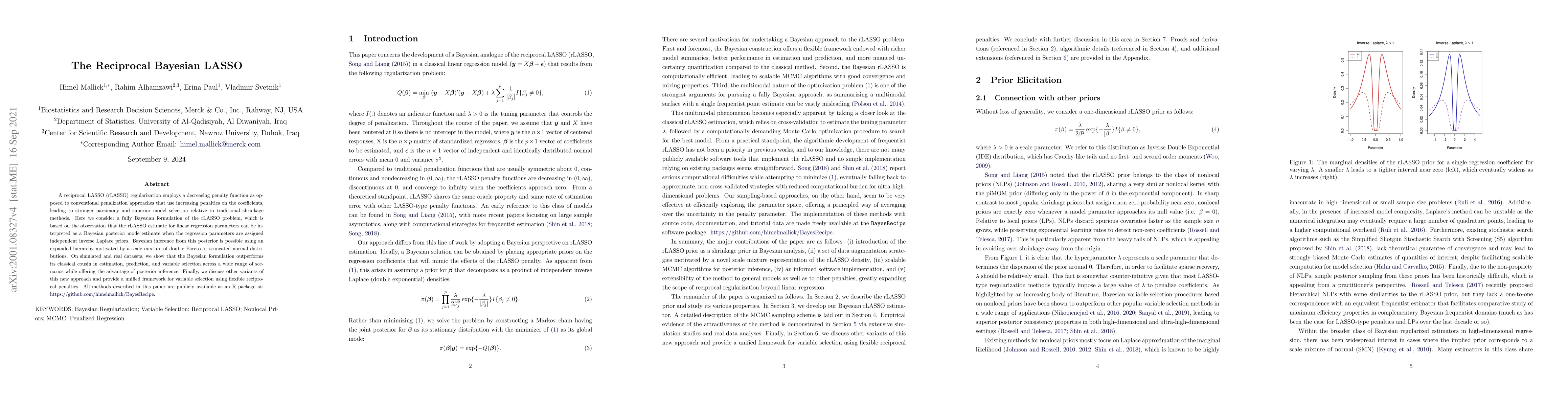 A new Bayesian approach, called reciprocal LASSO, outperforms traditional methods in estimation, prediction, and variable selection across various scenarios, offering the advantage of posterior inference.
