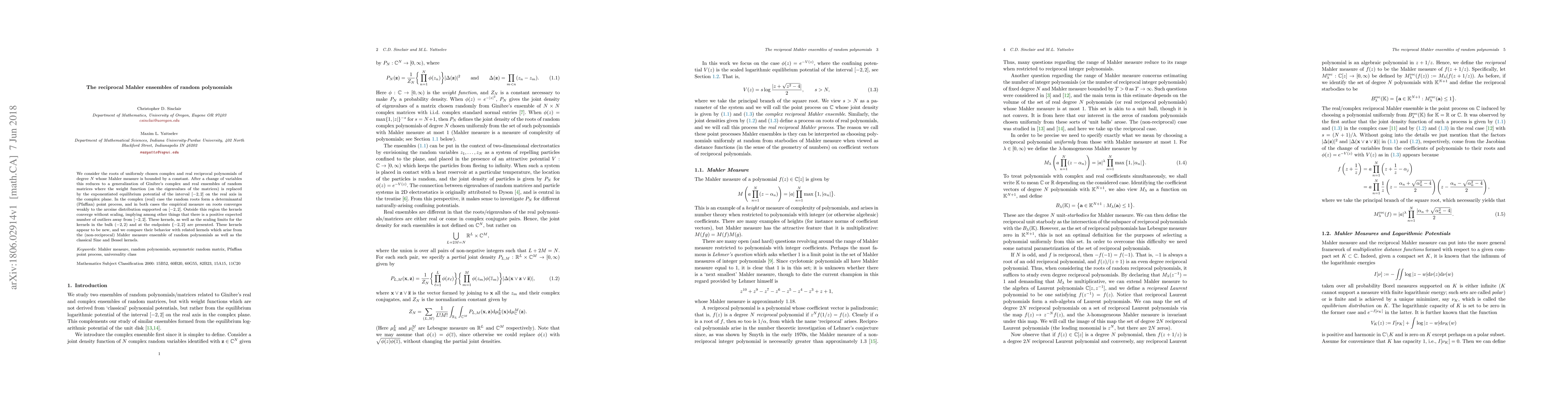 We consider the roots of uniformly chosen complex and real reciprocal polynomials of degree $N$ whose Mahler measure is bounded by a constant. After a change of variables this reduces to a generalization of Ginibre's complex and real ensembles of random matrices where the weight function (on the eigenvalues of the matrices) is replaced by the exponentiated equilibrium potential of the interval $[-2,2]$ on the real axis in the complex plane. In the complex (real) case the random roots form a determinantal (Pfaffian) point process, and in both cases the empirical measure on roots converges weakly to the arcsine distribution supported on $[-2,2]$. Outside this region the kernels converge without scaling, implying among other things that there is a positive expected number of outliers away from $[-2,2]$. These kernels, as well as the scaling limits for the kernels in the bulk $(-2,2)$ and at the endpoints $\{-2,2\}$ are presented. These kernels appear to be new, and we compare their behavior with related kernels which arise from the (non-reciprocal) Mahler measure ensemble of random polynomials as well as the classical Sine and Bessel kernels.