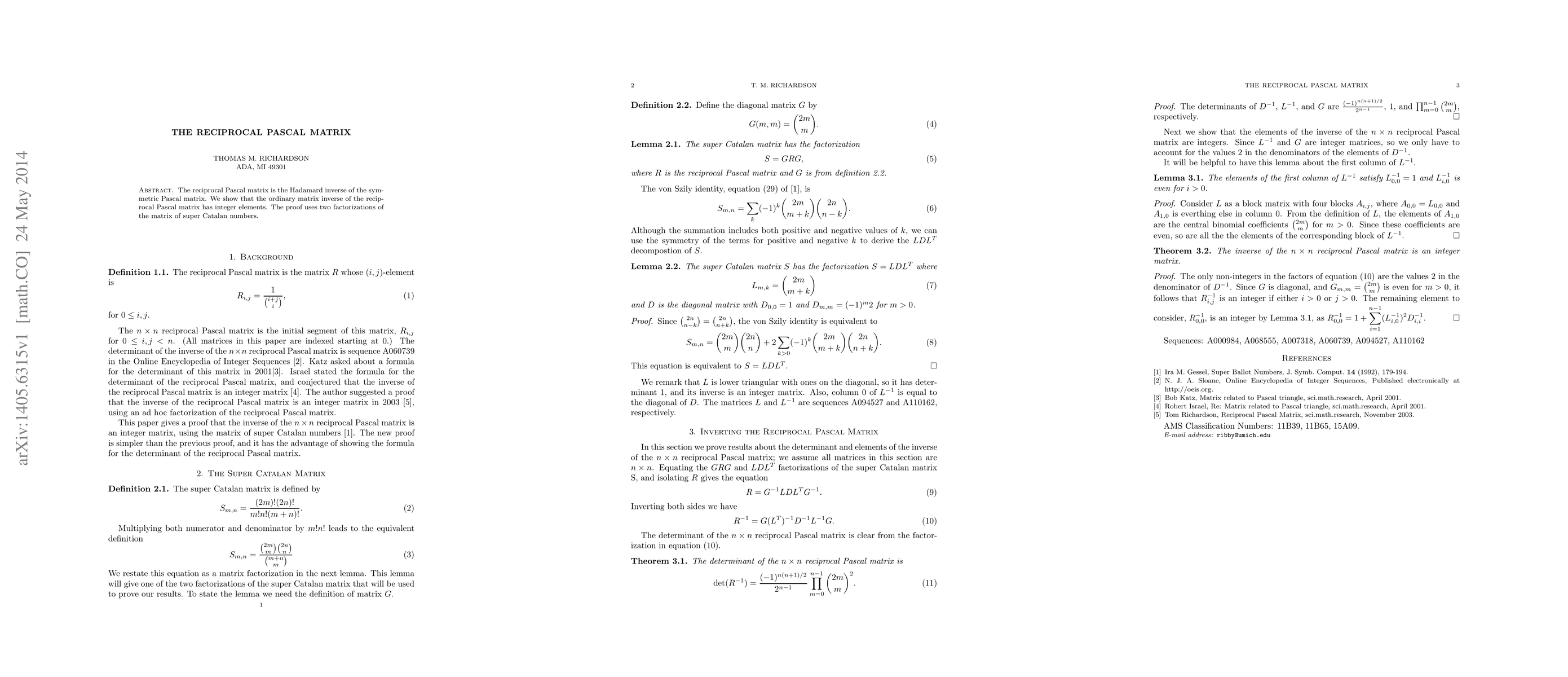 The reciprocal Pascal matrix is the Hadamard inverse of the symmetric Pascal matrix. We show that the ordinary matrix inverse of the reciprocal Pascal matrix has integer elements. The proof uses two factorizations of the matrix of super Catalan numbers.