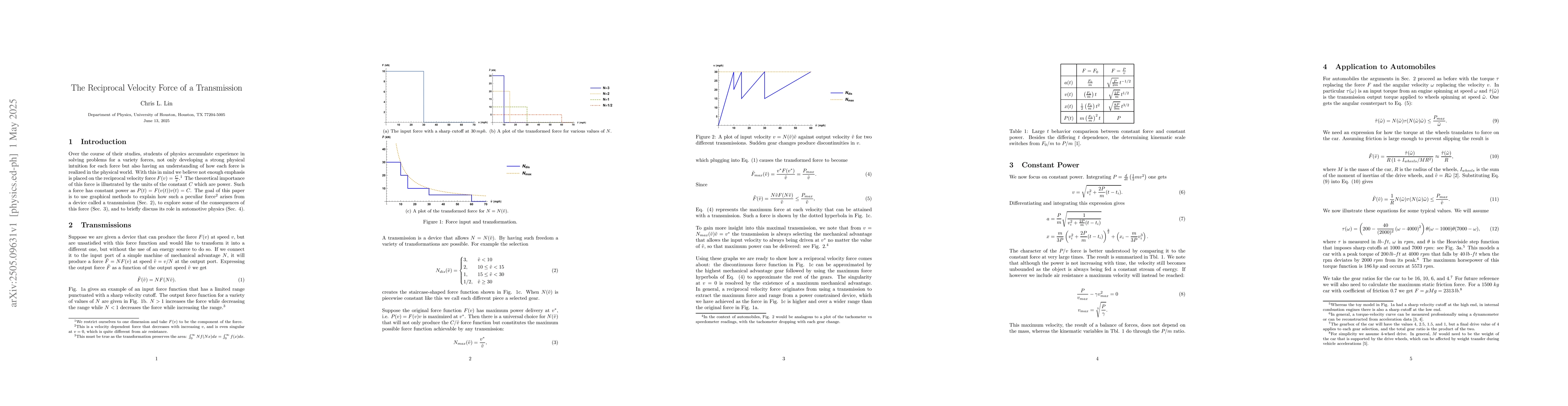 Over the course of their studies, students of physics accumulate experience in solving problems for a variety forces, not only developing a strong physical intuition for each force but also having an understanding of how each force is realized in the physical world. With this in mind we believe not enough emphasis is placed on the reciprocal velocity force $F(v)=\frac{C}{v}$. The theoretical importance of this force is illustrated by the units of the constant $C$ which are power. Such a force has constant power as $P(t)=F(v(t))v(t)=C$. The goal of this paper is to use graphical methods to explain how such a peculiar force arises from a device called a transmission, to explore some of the consequences of this force, and to briefly discuss its role in automotive physics.