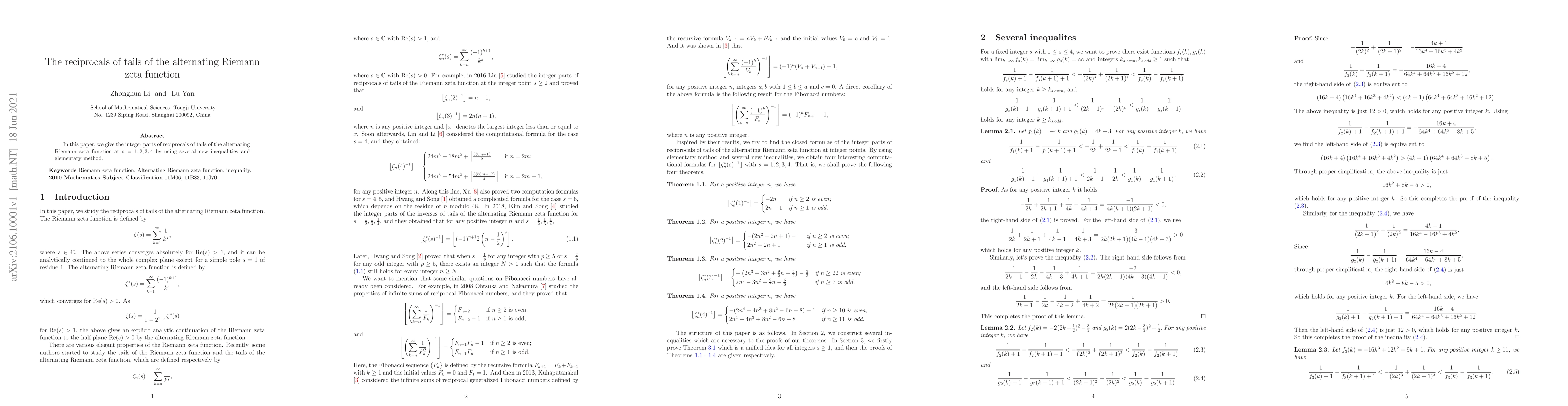 In this paper, we give the integer parts of reciprocals of tails of the alternating Riemann zeta function at $s=1,2,3,4$ by using several new inequalities and elementary method.