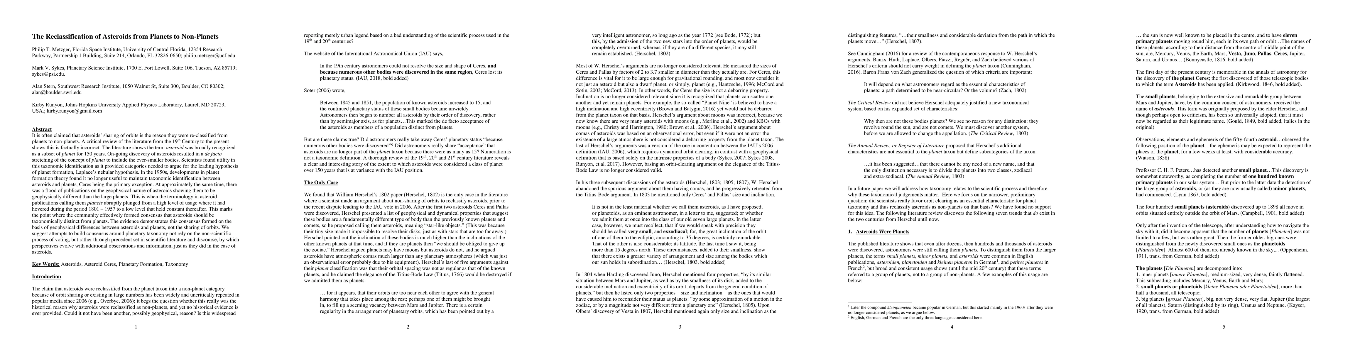 This paper argues that asteroids were reclassified from planets not due to shared orbits but because of geophysical differences revealed in the 1950s. The term "asteroid" was historically used as a subset of planet, but consensus shifted based on scientific discoveries rather than orbit sharing.
