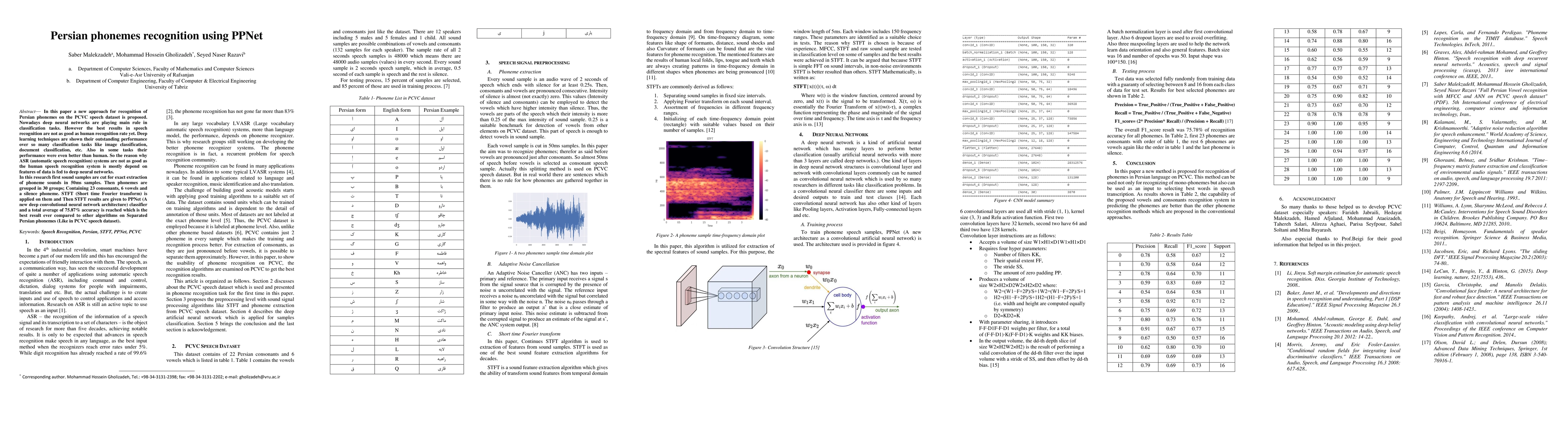 This paper proposes a novel PPNet deep convolutional neural network for recognizing Persian phonemes in the PCVC speech dataset, achieving 75.87% accuracy. The method extracts 50ms phoneme samples, divides them into 30 groups, and uses STFT to feed data into the PPNet classifier, outperforming other algorithms.