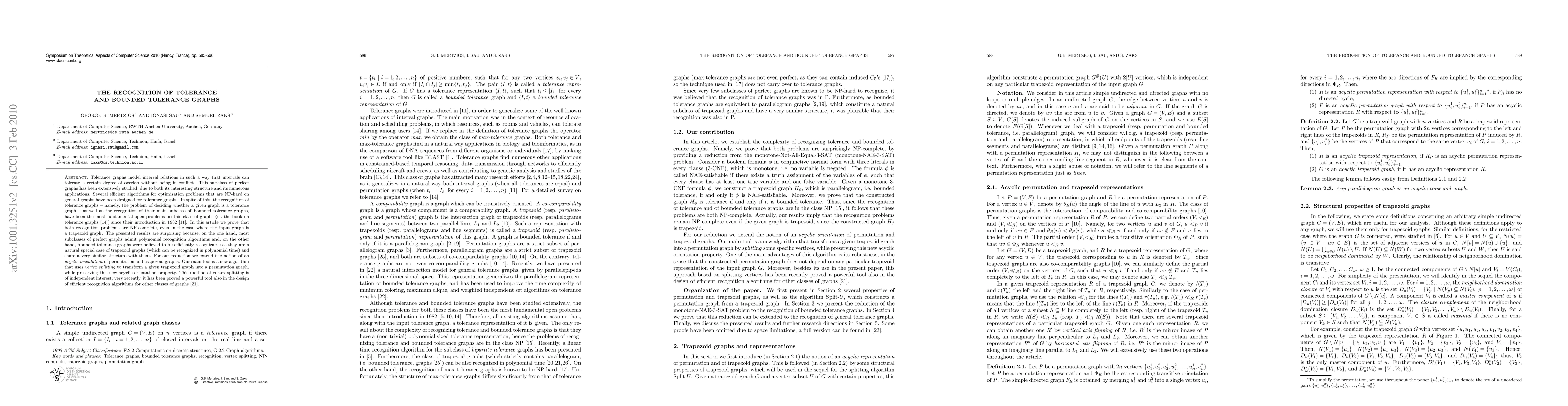 Tolerance graphs model interval relations in such a way that intervals can tolerate a certain degree of overlap without being in conflict. This subclass of perfect graphs has been extensively studied, due to both its interesting structure and its numerous applications. Several efficient algorithms for optimization problems that are NP-hard on general graphs have been designed for tolerance graphs. In spite of this, the recognition of tolerance graphs - namely, the problem of deciding whether a given graph is a tolerance graph - as well as the recognition of their main subclass of bounded tolerance graphs, have been the most fundamental open problems on this class of graphs (cf. the book on tolerance graphs \cite{GolTol04}) since their introduction in 1982 \cite{GoMo82}. In this article we prove that both recognition problems are NP-complete, even in the case where the input graph is a trapezoid graph. The presented results are surprising because, on the one hand, most subclasses of perfect graphs admit polynomial recognition algorithms and, on the other hand, bounded tolerance graphs were believed to be efficiently recognizable as they are a natural special case of trapezoid graphs (which can be recognized in polynomial time) and share a very similar structure with them. For our reduction we extend the notion of an \emph{acyclic orientation} of permutation and trapezoid graphs. Our main tool is a new algorithm that uses \emph{vertex splitting} to transform a given trapezoid graph into a permutation graph, while preserving this new acyclic orientation property. This method of vertex splitting is of independent interest; very recently, it has been proved a powerful tool also in the design of efficient recognition algorithms for other classes of graphs \cite{MC-Trapezoid}.
