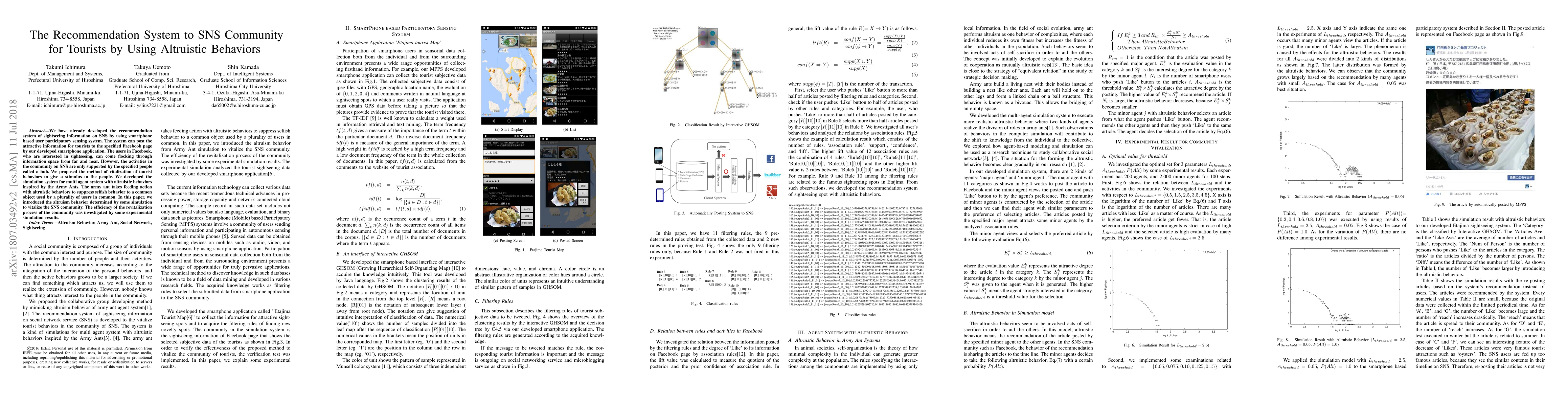 This paper develops a recommendation system for tourist information on SNS using a smartphone-based participatory sensing system. It introduces altruistic behaviors inspired by army ants to stimulate community engagement and revitalize the SNS tourist community, with experimental simulations demonstrating the effectiveness of this approach.