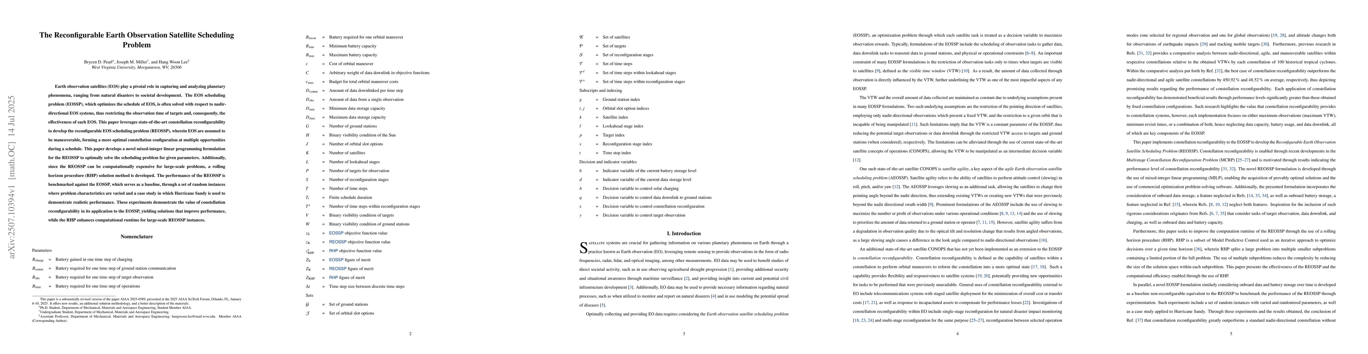 Earth observation satellites (EOS) play a pivotal role in capturing and analyzing planetary phenomena, ranging from natural disasters to societal development. The EOS scheduling problem (EOSSP), which optimizes the schedule of EOS, is often solved with respect to nadir-directional EOS systems, thus restricting the observation time of targets and, consequently, the effectiveness of each EOS. This paper leverages state-of-the-art constellation reconfigurability to develop the reconfigurable EOS scheduling problem (REOSSP), wherein EOS are assumed to be maneuverable, forming a more optimal constellation configuration at multiple opportunities during a schedule. This paper develops a novel mixed-integer linear programming formulation for the REOSSP to optimally solve the scheduling problem for given parameters. Additionally, since the REOSSP can be computationally expensive for large-scale problems, a rolling horizon procedure (RHP) solution method is developed. The performance of the REOSSP is benchmarked against the EOSSP, which serves as a baseline, through a set of random instances where problem characteristics are varied and a case study in which Hurricane Sandy is used to demonstrate realistic performance. These experiments demonstrate the value of constellation reconfigurability in its application to the EOSSP, yielding solutions that improve performance, while the RHP enhances computational runtime for large-scale REOSSP instances.