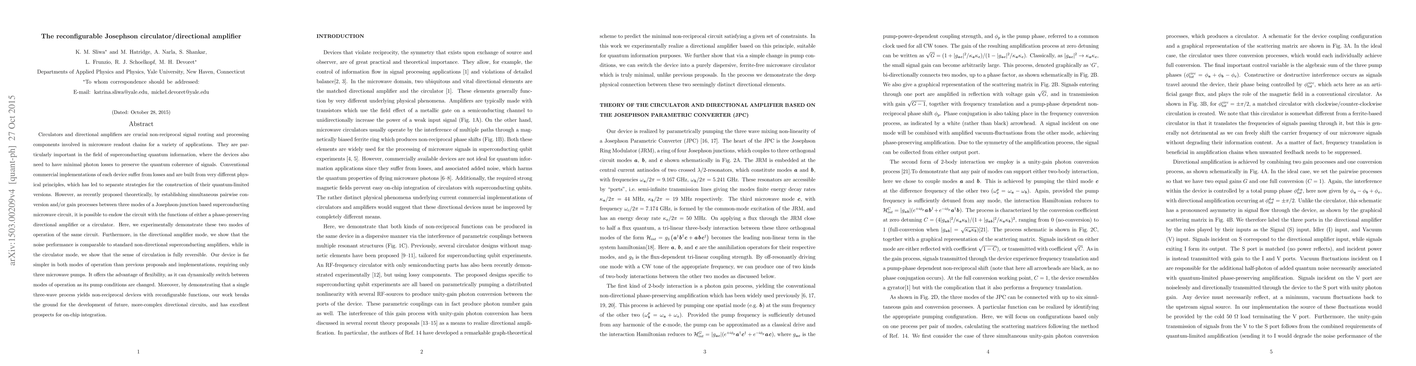 This paper demonstrates a reconfigurable Josephson circulator/directional amplifier that can switch between two modes using a single superconducting microwave circuit with three microwave pumps. The device shows comparable noise performance in amplifier mode and reversible circulation in circulator mode, offering simplicity, flexibility, and potential for future complex directional circuits.