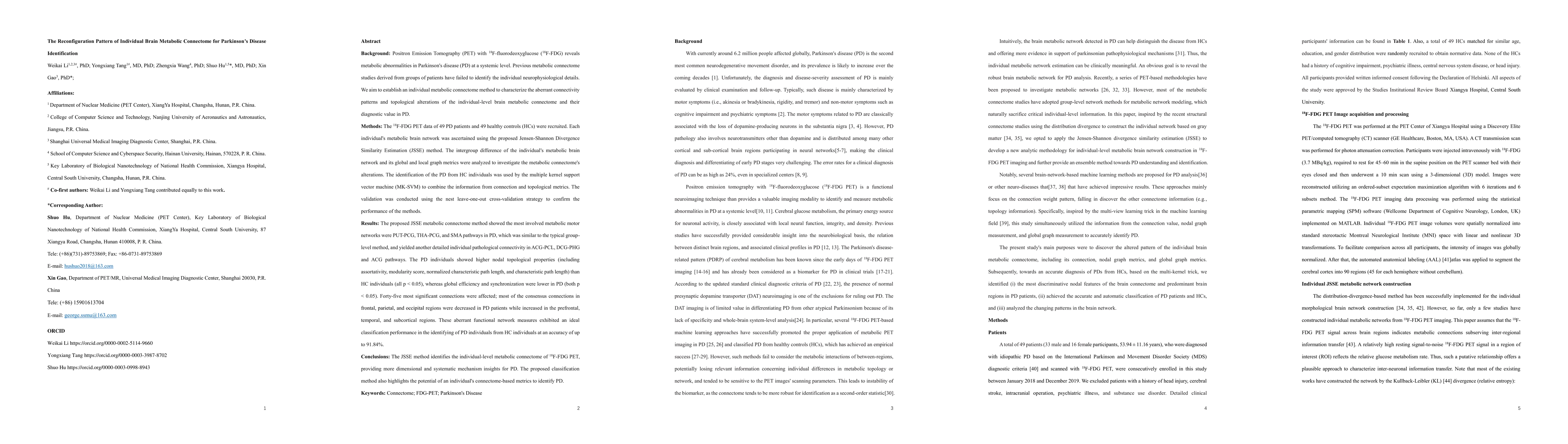 A new method to analyze brain metabolic connectome was developed for Parkinson's disease identification, revealing specific networks affected by the disease. This method showed high accuracy in identifying PD patients with up to 91.84% correctness.