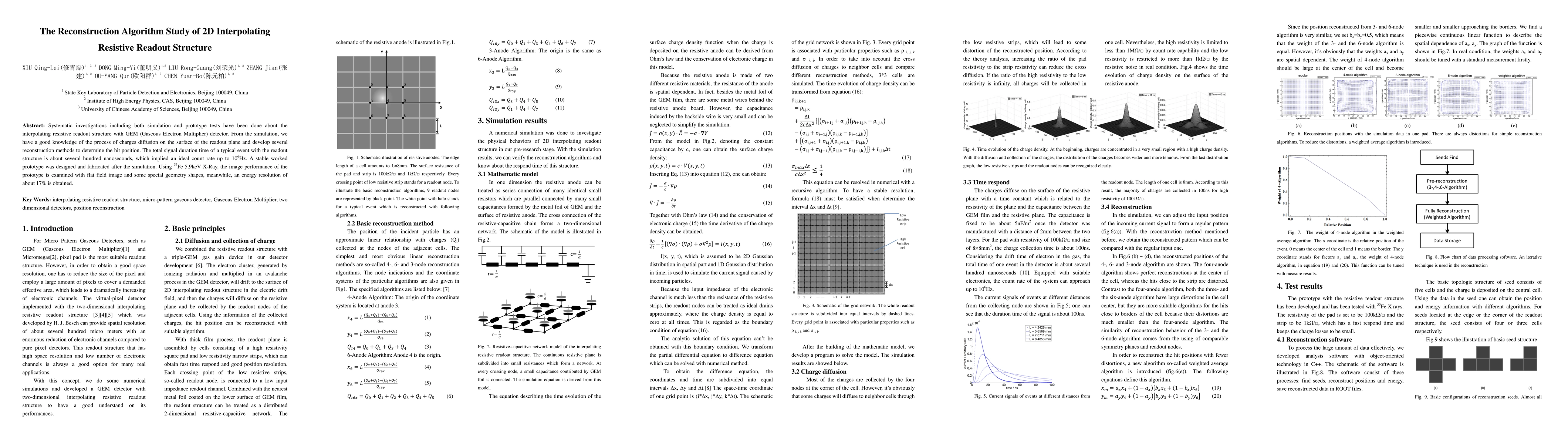 This paper investigates the interpolating resistive readout structure with GEM detectors through simulations and prototype tests, developing reconstruction methods to determine hit positions. The prototype demonstrates an ideal count rate up to 106Hz and an energy resolution of about 17% when tested with 55Fe X-rays.