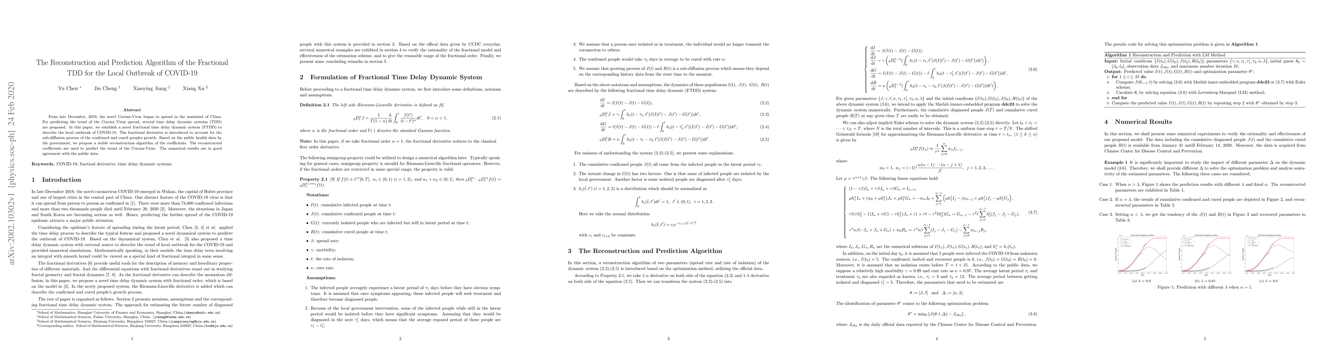 From late December, 2019, the novel Corona-Virus began to spread in the mainland of China. For predicting the trend of the Corona Virus spread, several time delay dynamic systems (TDD) are proposed. In this paper, we establish a novel fractional time delay dynamic system (FTDD) to describe the local outbreak of COVID-19. The fractional derivative is introduced to account for the sub-diffusion process of the confirmed and cured peoples growth. Based on the public health data by the government, we propose a stable reconstruction algorithm of the coefficients. The reconstructed coefficients are used to predict the trend of the Corona-Virus. The numerical results are in good agreement with the public data.