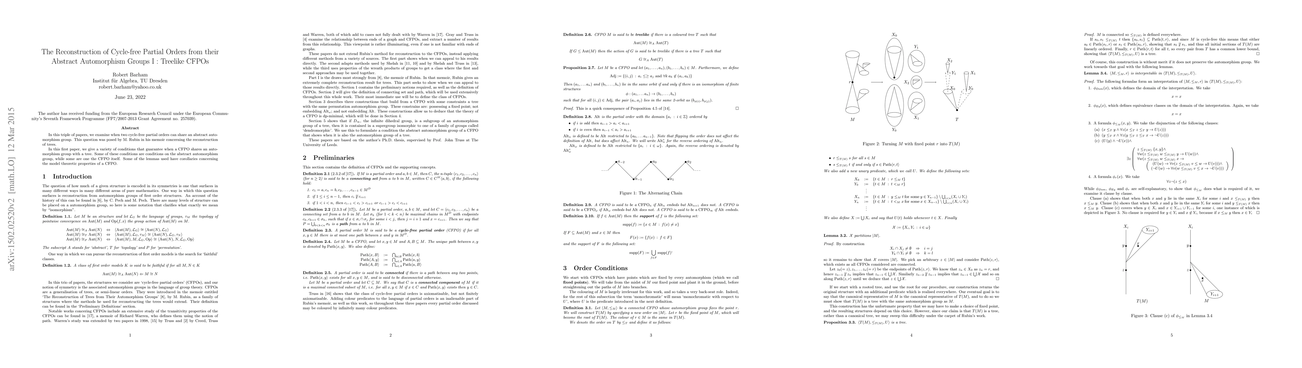 In this triple of papers, we examine when two cycle-free partial orders can share an abstract automorphism group. This question was posed by M. Rubin in his memoir concerning the reconstruction of trees. In this first paper, we give a variety of conditions that guarantee when a CFPO shares an automorphism group with a tree. Some of these conditions are conditions on the abstract automorphism group, while some are one the CFPO itself. Some of the lemmas used have corollaries concerning the model theoretic properties of a CFPO.