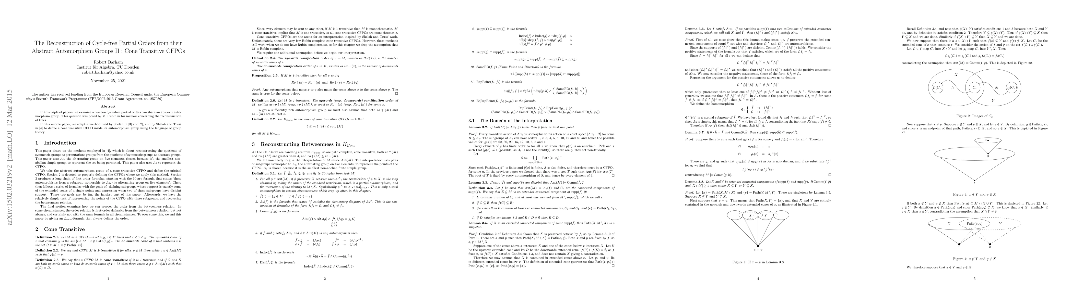 In this triple of papers, we examine when two cycle-free partial orders can share an abstract automorphism group. This question was posed by M. Rubin in his memoir concerning the reconstruction of trees. In this middle paper, we adapt a method used by Shelah in \cite{ShelahPermutation} and \cite{ShelahPermutationErrata}, and by Shelah and Truss in \cite{ShelahTrussQuotients} to define a cone transitive CFPO inside its automorphism group using the language of group theory.