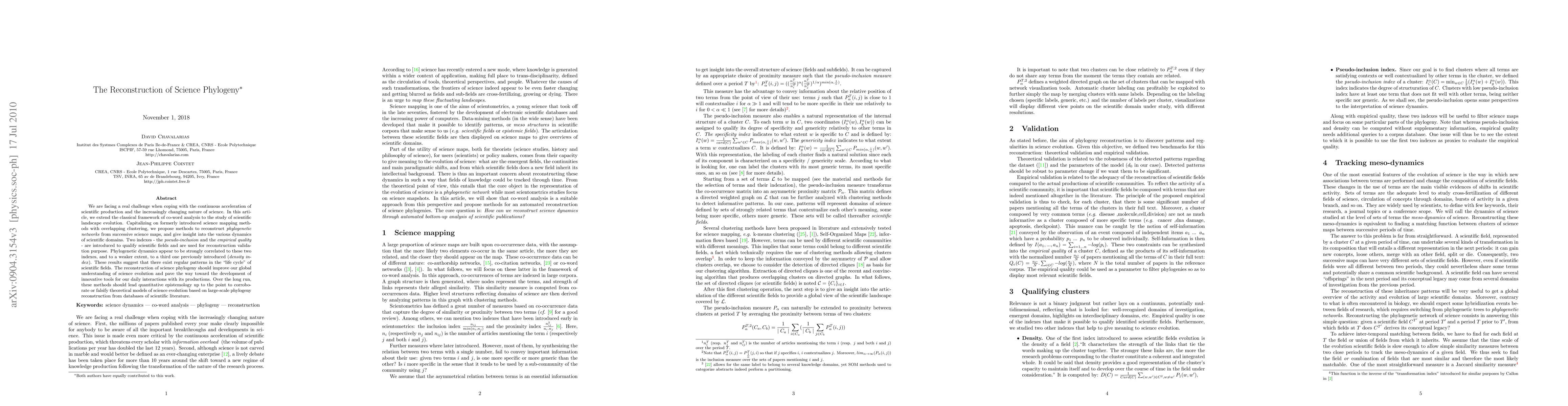 This work expands on Callon et al.'s seminal work by proposing the first automated methods for reconstructing the entire phylogeny of a scientific domain, addressing classical limitations of scientometrics.
