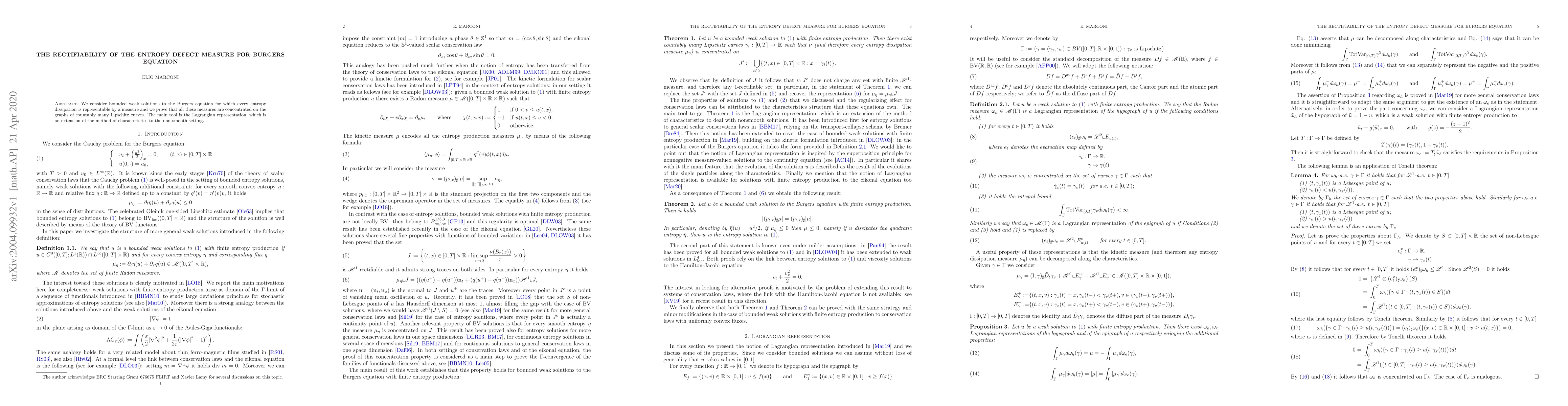 Summary: This paper proves that entropy defect measures for weak solutions of the Burgers equation are rectifiable and lie on the graphs of countably many Lipschitz curves, utilizing a Lagrangian representation method to extend the classical method of characteristics.