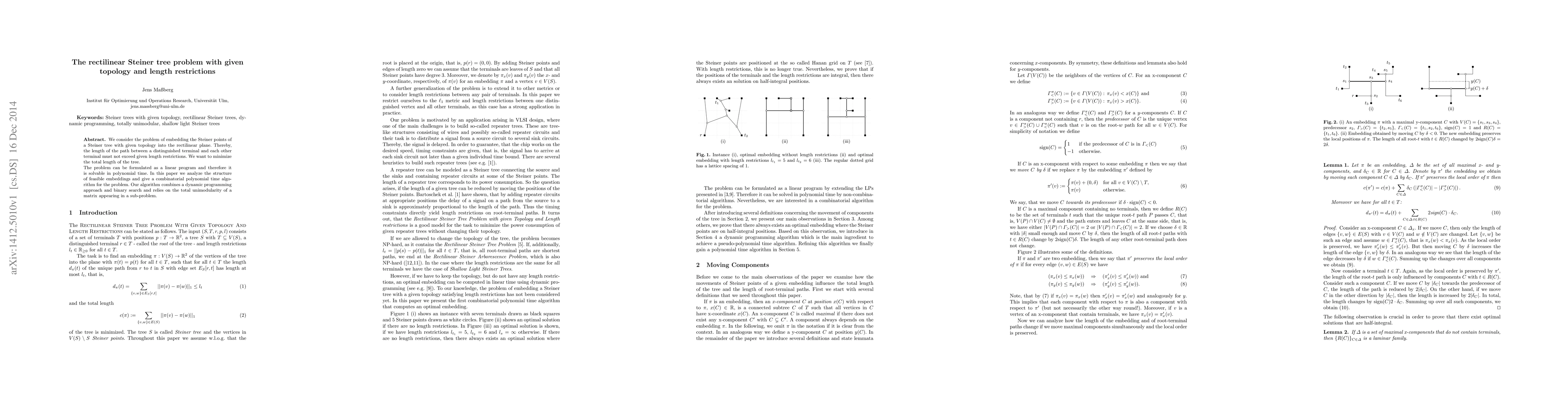 We consider the problem of embedding the Steiner points of a Steiner tree with given topology into the rectilinear plane. Thereby, the length of the path between a distinguished terminal and each other terminal must not exceed given length restrictions. We want to minimize the total length of the tree. The problem can be formulated as a linear program and therefore it is solvable in polynomial time. In this paper we analyze the structure of feasible embeddings and give a combinatorial polynomial time algorithm for the problem. Our algorithm combines a dynamic programming approach and binary search and relies on the total unimodularity of a matrix appearing in a sub-problem.