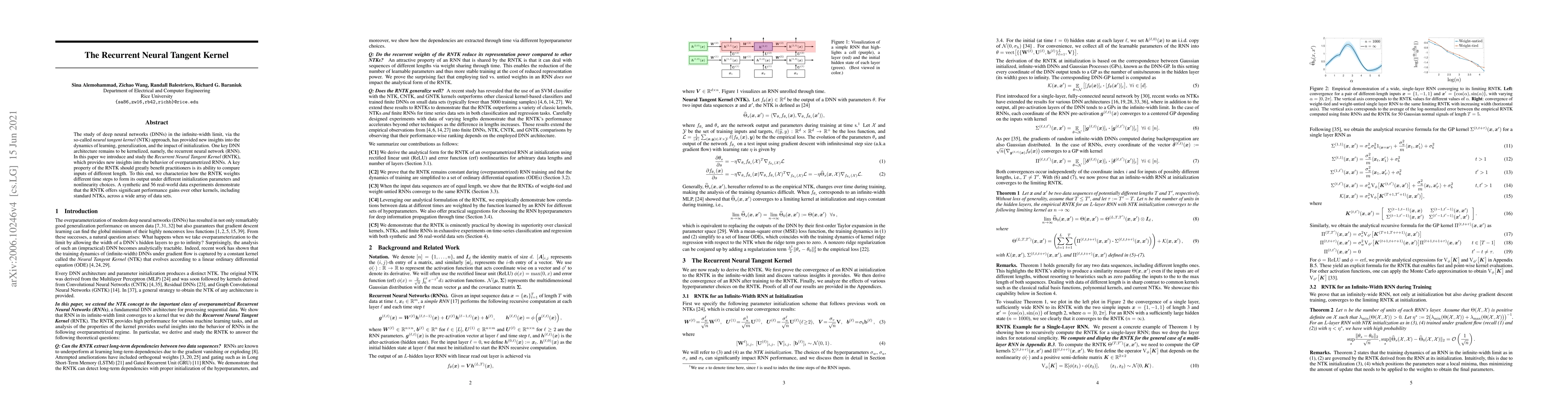 This paper introduces the Recurrent Neural Tangent Kernel (RNTK) to analyze the behavior of overparametrized recurrent neural networks (RNNs), providing insights into learning dynamics and generalization. The RNTK's ability to compare inputs of different lengths offers significant performance gains over other kernels in both synthetic and real-world data experiments.
