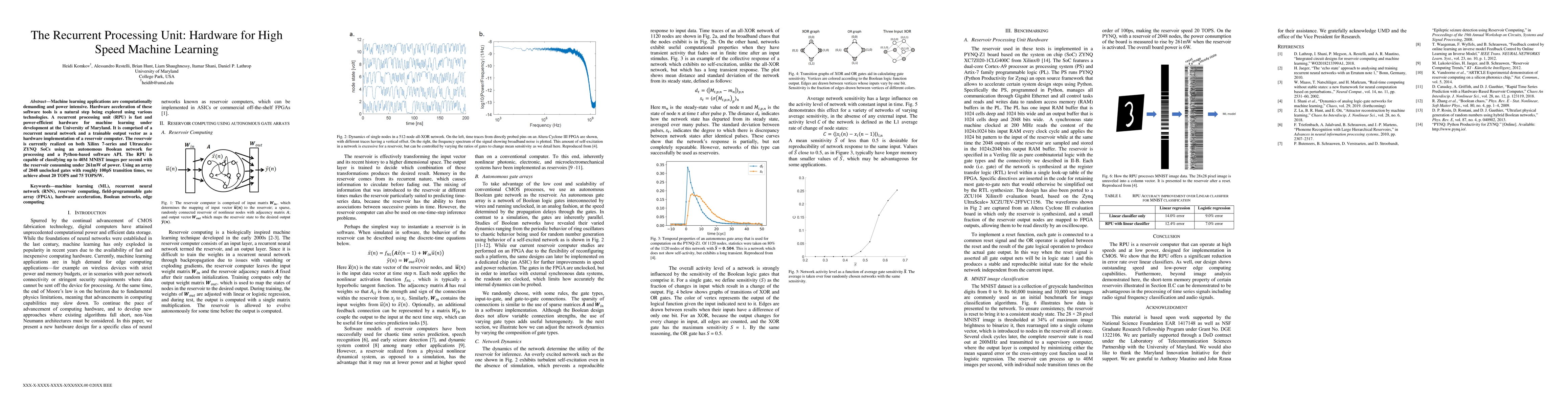 The Recurrent Processing Unit (RPU) is a power-efficient hardware designed for high-speed machine learning, capable of classifying up to 40M MNIST images per second while consuming under 261mW, achieving 20 TOPS and 75 TOPS/W. Implemented on Xilinx ZYNQ SoCs, it uses a reservoir computer with an autonomous Boolean network.