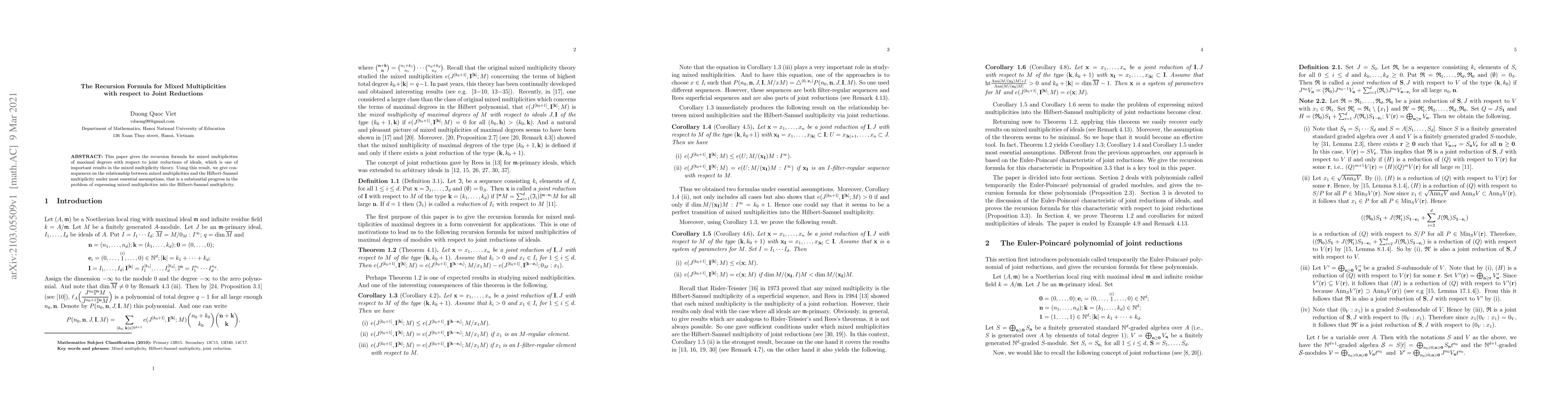 This paper gives the recursion formula for mixed multiplicities of maximal degrees with respect to joint reductions of ideals, which is one of important results in the mixed multiplicity theory. Using this result, we give consequences on the relationship between mixed multiplicities and the Hilbert-Samuel multiplicity under most essential assumptions, that is a substantial progress in the problem of expressing mixed multiplicities into the Hilbert-Samuel multiplicity.