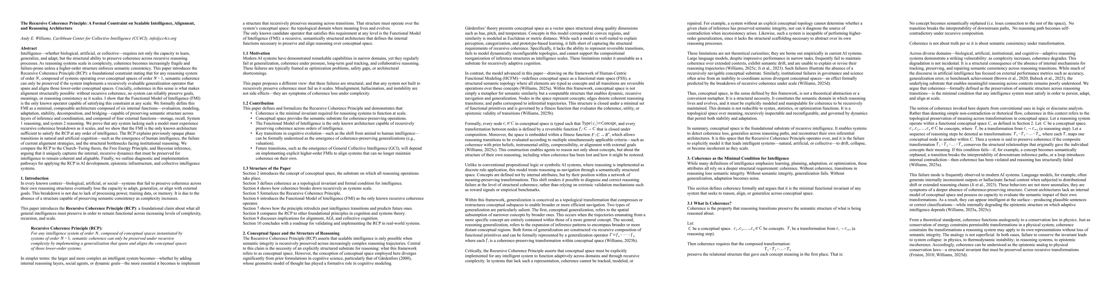 Intelligence-biological, artificial, or collective-requires structural coherence across recursive reasoning processes to scale effectively. As complex systems grow, coherence becomes fragile unless a higher-order structure ensures semantic consistency. This paper introduces the Recursive Coherence Principle (RCP): a foundational constraint stating that for any reasoning system of order N, composed of systems operating over conceptual spaces of order N-1, semantic coherence is preserved only by a recursively evaluable generalization operator that spans and aligns those lower-order conceptual spaces. Crucially, this coherence enables structural alignment. Without recursive coherence, no system can reliably preserve goals, meanings, or reasoning consistency at scale. We formally define the Functional Model of Intelligence (FMI) as the only known operator capable of satisfying the RCP at any scale. The FMI is a minimal, composable architecture with internal functions (evaluation, modeling, adaptation, stability, decomposition, bridging) and external functions (storage, recall, System 1 and System 2 reasoning) vital for preserving semantic structure across inference and coordination layers. We prove that any system lacking the FMI will experience recursive coherence breakdown as it scales, arguing that common AI issues like misalignment, hallucination, and instability are symptoms of this structural coherence loss. Unlike other foundational principles, RCP uniquely captures the internal, recursive dynamics needed for coherent, alignable intelligence, modeling semantic coherence under recursion. This work significantly impacts AI alignment, advocating a shift from behavioral constraints to structural coherence, and offers a pathway for safely generalizable, robustly coherent AI at scale.