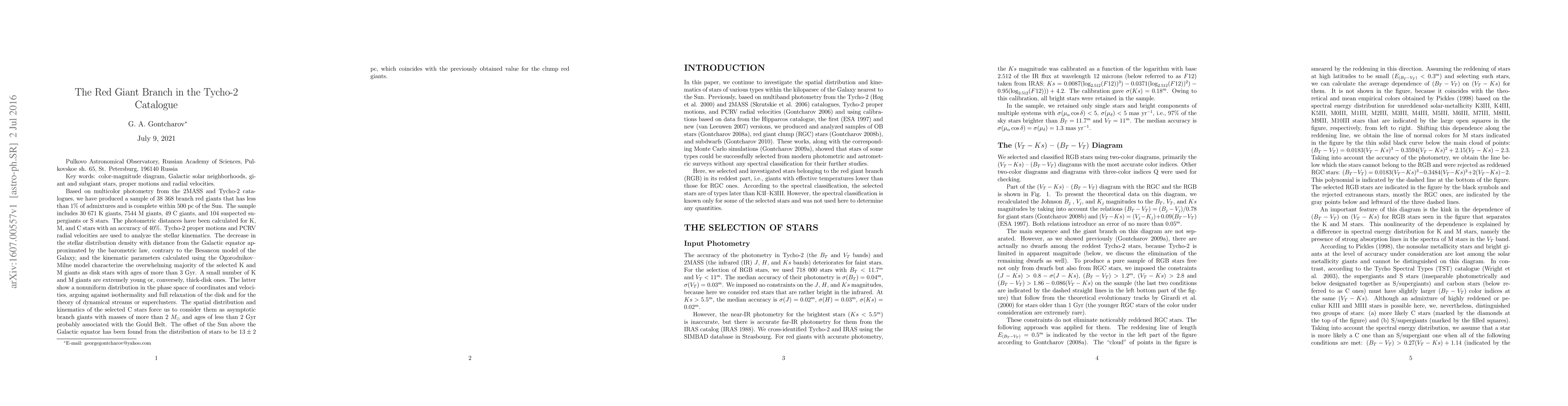 Based on multicolor photometry from the 2MASS and Tycho-2 catalogues, we have produced a sample of 38 368 branch red giants that has less than 1\% of admixtures and is complete within 500 pc of the Sun. The sample includes 30 671 K giants, 7544 M giants, 49 C giants, and 104 suspected supergiants or S stars. The photometric distances have been calculated for K, M, and C stars with an accuracy of 40\%. Tycho-2 proper motions and PCRV radial velocities are used to analyze the stellar kinematics. The decrease in the stellar distribution density with distance from the Galactic equator approximated by the barometric law, contrary to the Besancon model of the Galaxy, and the kinematic parameters calculated using the Ogorodnikov--Milne model characterize the overwhelming majority of the selected K and M giants as disk stars with ages of more than 3 Gyr. A small number of K and M giants are extremely young or, conversely, thick-disk ones. The latter show a nonuniform distribution in the phase space of coordinates and velocities, arguing against isothermality and full relaxation of the disk and for the theory of dynamical streams or superclusters. The spatial distribution and kinematics of the selected C stars force us to consider them as asymptotic branch giants with masses of more than 2 $M_{\odot}$ and ages of less than 2 Gyr probably associated with the Gould Belt. The offset of the Sun above the Galactic equator has been found from the distribution of stars to be $13\pm2$ pc, which coincides with the previously obtained value for the clump red giants.