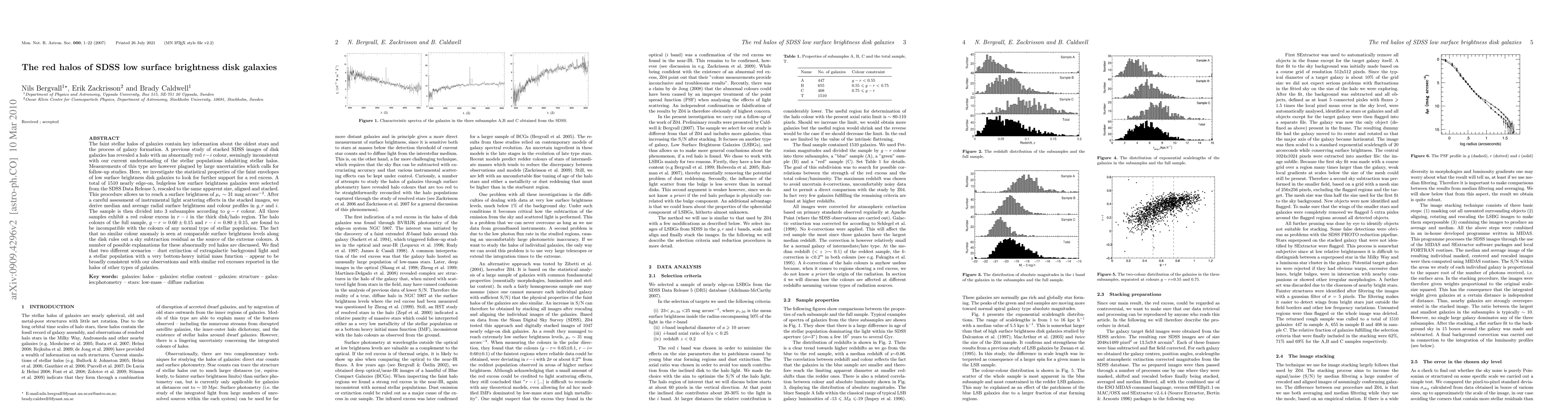 This study investigates the faint stellar halos of low surface brightness disk galaxies from SDSS, revealing a red colour excess in r-i that contradicts typical stellar population models. Two plausible explanations are dust extinction of extragalactic background light and a bottom-heavy initial mass function.