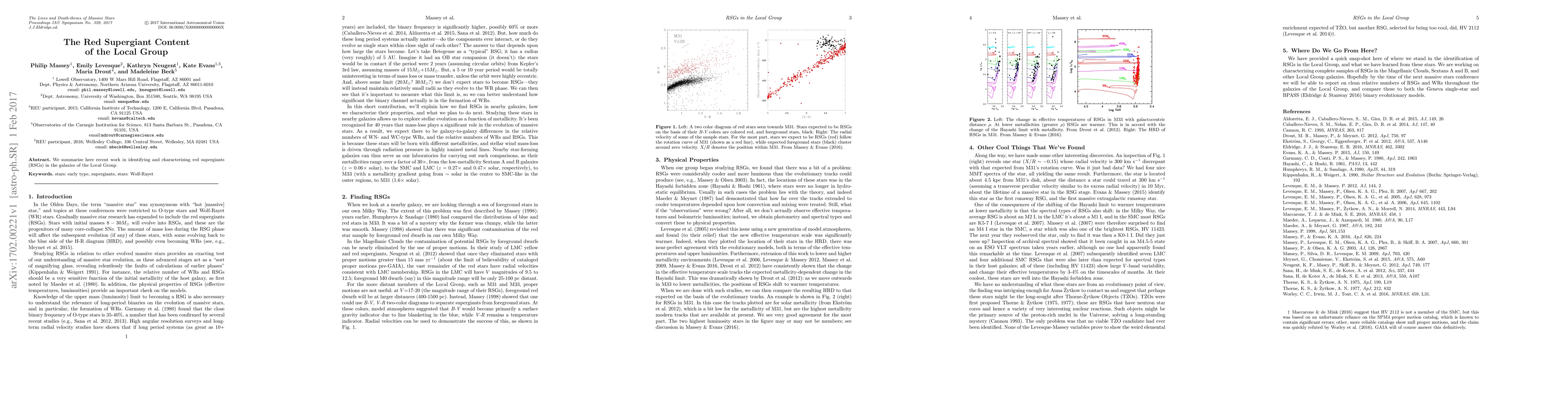 We summarize here recent work in identifying and characterizing red supergiants (RSGs) in the galaxies of the Local Group.