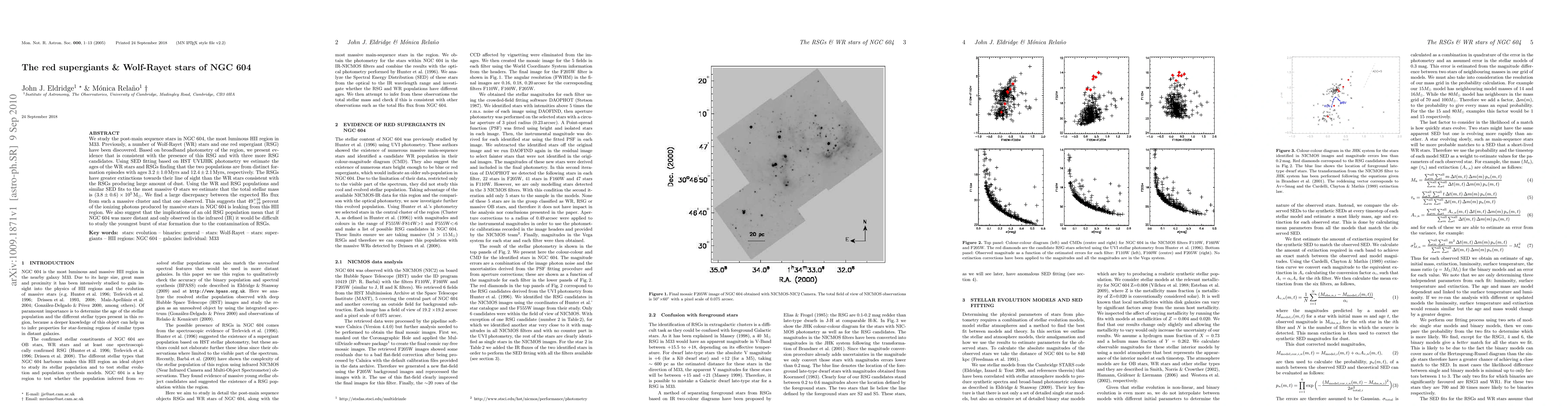 We study the post-main sequence stars in NGC 604, the most luminous HII region in M33. Previously, a number of Wolf-Rayet (WR) stars and one red supergiant (RSG) have been discovered. Based on broadband photometry of the region, we present evidence that is consistent with the presence of this RSG and with three more RSG candidates. Using SED fitting based on HST UVIJHK photometry we estimate the ages of the WR stars and RSGs finding that the two populations are from distinct formation episodes with ages 3.2$\pm%1.0Myrs and 12.4$\pm$2.1Myrs, respectively. The RSGs have greater extinctions towards their line of sight than the WR stars consistent with the RSGs producing large amount of dust. Using the WR and RSG populations and similar SED fits to the most massive O stars we estimate that the total stellar mass is (3.8 $\pm$ 0.6) x 10^5Msun. We find a large discrepancy between the expected H{\alpha} flux from such a massive cluster and that one observed. This suggests that 49 (+16,-19) percent of the ionizing photons produced by massive stars in NGC 604 is leaking from this HII region. We also suggest that the implications of an old RSG population mean that if NGC 604 was more distant and only observed in the infrared (IR) it would be difficult to study the youngest burst of star formation due to the contamination of RSGs.