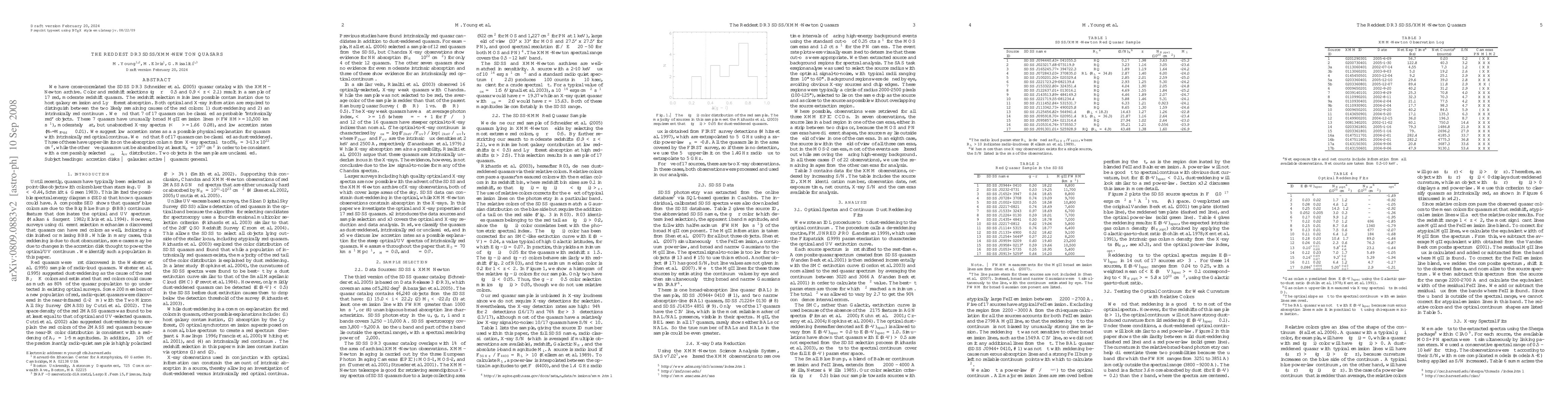 This study identifies 17 red, moderate redshift quasars from the SDSS DR3 catalog, cross-referenced with XMM-Newton data. It finds that 7 quasars likely have intrinsically red continua, possibly due to low accretion rates, while 8 are likely dust-reddened, with varying levels of absorption.