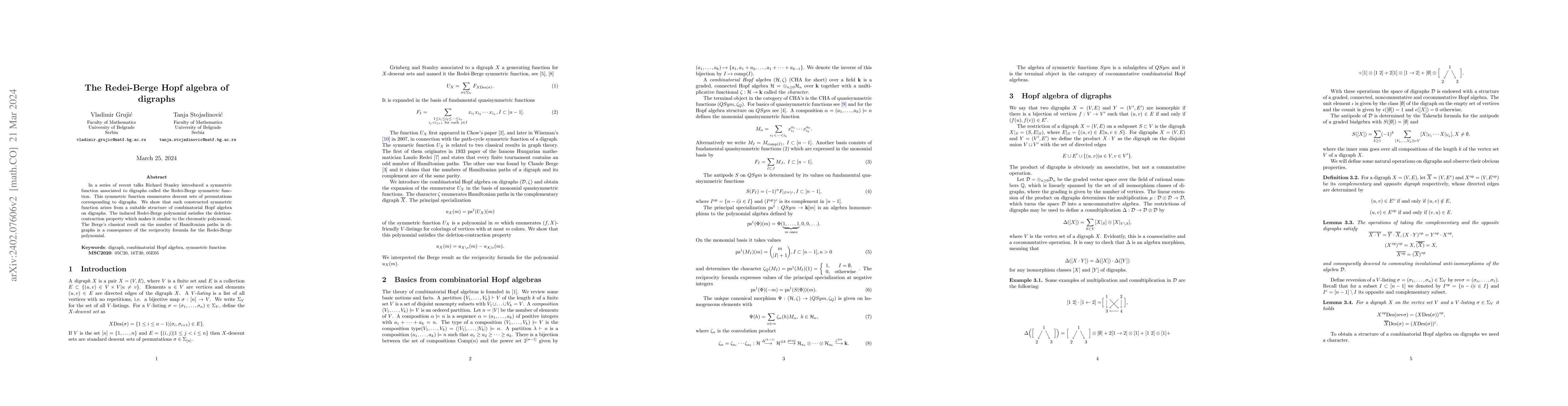 This paper introduces the Redei-Berge symmetric function associated with digraphs, showing it arises from a combinatorial Hopf algebra structure. It demonstrates the function's deletion-contraction property, similar to the chromatic polynomial, and links it to Berge's theorem on Hamiltonian paths via a reciprocity formula.
