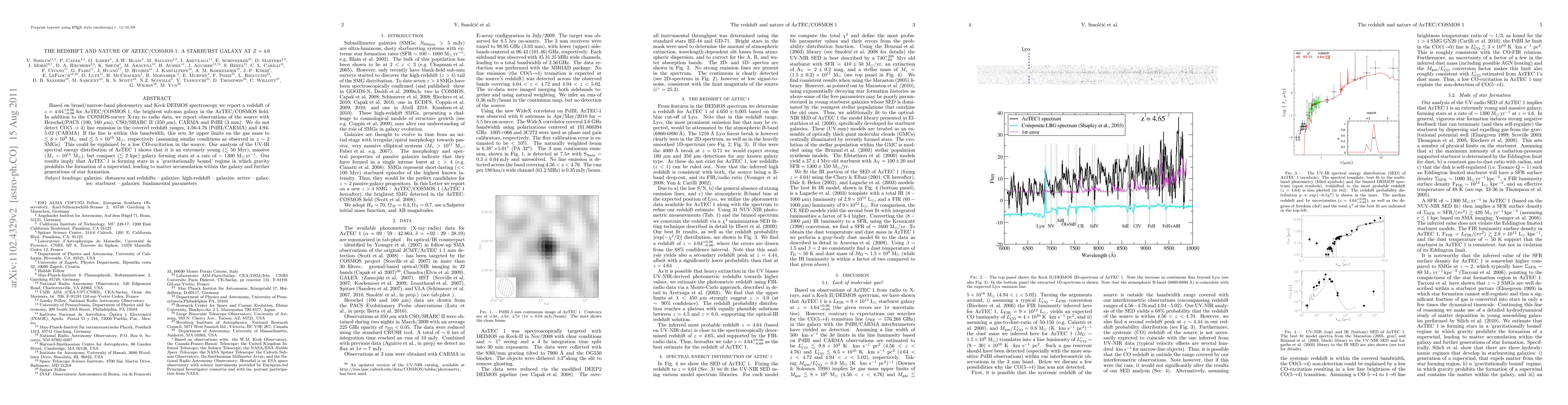 AzTEC/COSMOS 1, a bright sub-mm galaxy at redshift z=4.64, is identified as a starburst galaxy with intense star formation (~1300 M_Sol/yr) in a compact, young (~50 Myr) structure. The lack of detectable CO emission suggests low CO-excitation, implying limited gas mass and a gravitationally bound star formation regime.