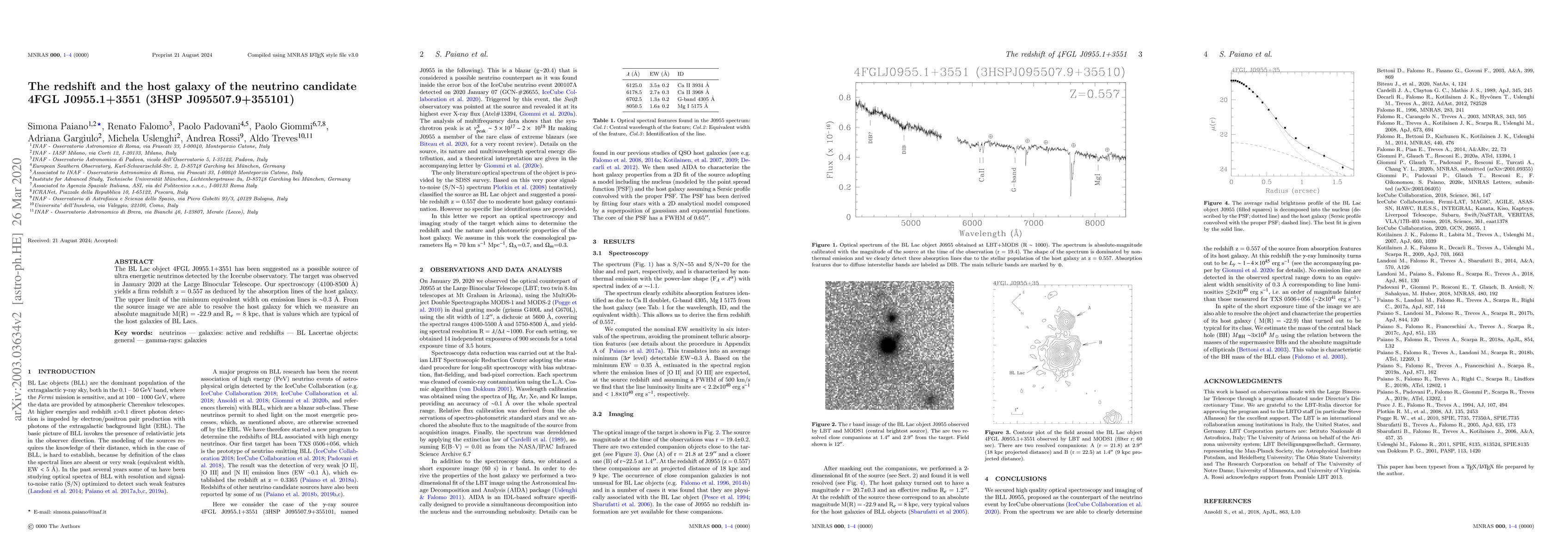 The BL Lac object 4FGLJ0955.1+3551 has been suggested as a possible source of ultra energetic neutrinos detected by the Icecube observatory. The target was observed in January 2020 at the Large Binocular Telescope. Our spectroscopy (4100-8500 Ang) yields a firm redshift z = 0.557 as deduced by the absorption lines of the host galaxy. The upper limit of the minimum equivalent width on emission lines is 0.3 Ang. From the source image we are able to resolve the host galaxy for which we measure an absolute magnitude M(R) = -22.9 and Re = 8 kpc, that is values which are typical of the host galaxies of BL Lacs.