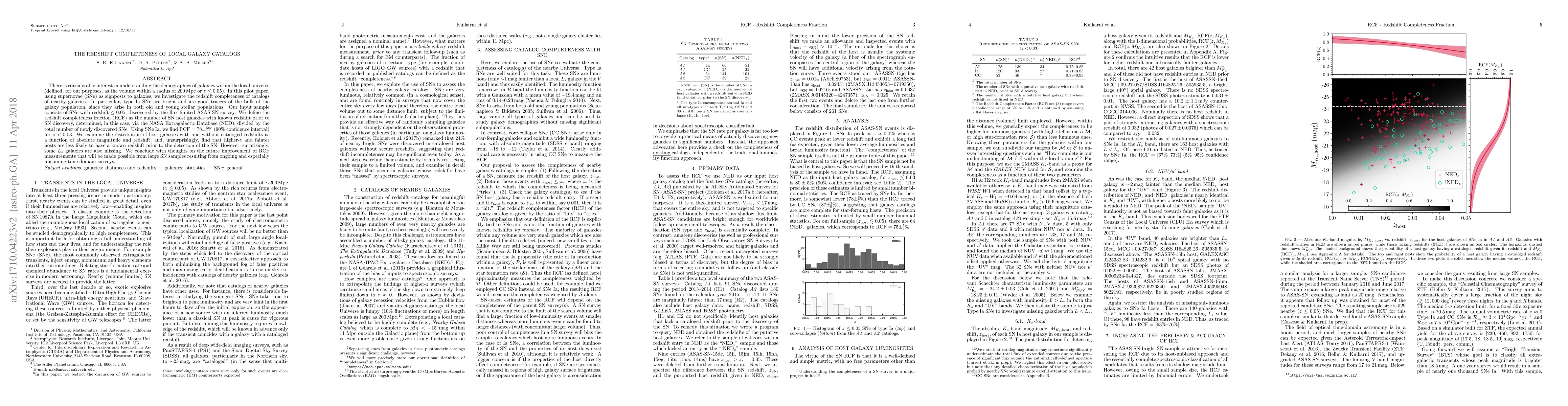 There is considerable interest in understanding the demographics of galaxies within the local universe (defined, for our purposes, as the volume within a radius of 200 Mpc or z<0.05). In this pilot paper, using supernovae (SNe) as signposts to galaxies, we investigate the redshift completeness of catalogs of nearby galaxies. In particular, type Ia SNe are bright and are good tracers of the bulk of the galaxy population, since they arise in both old and young stellar populations. Our input sample consists of SNe with redshift < 0.05, discovered by the flux-limited ASAS-SN survey. We define the redshift completeness fraction (RCF) as the number of SN host galaxies with known redshift prior to SN discovery, determined, in this case, via the NASA Extragalactic Database (NED), divided by the total number of newly discovered SNe. Using SNe Ia, we find RCF = 78 (+6, -7, 90% confidence interval) for z < 0.03. We examine the distribution of host galaxies with and without cataloged redshifts as a function of absolute magnitude and redshift, and, unsurprisingly, find that higher-z and fainter hosts are less likely to have a known redshift prior to the detection of the SN. However, surprisingly, some L* galaxies are also missing. We conclude with thoughts on the future improvement of RCF measurements that will be made possible from large SN samples resulting from ongoing and especially upcoming time-domain surveys.