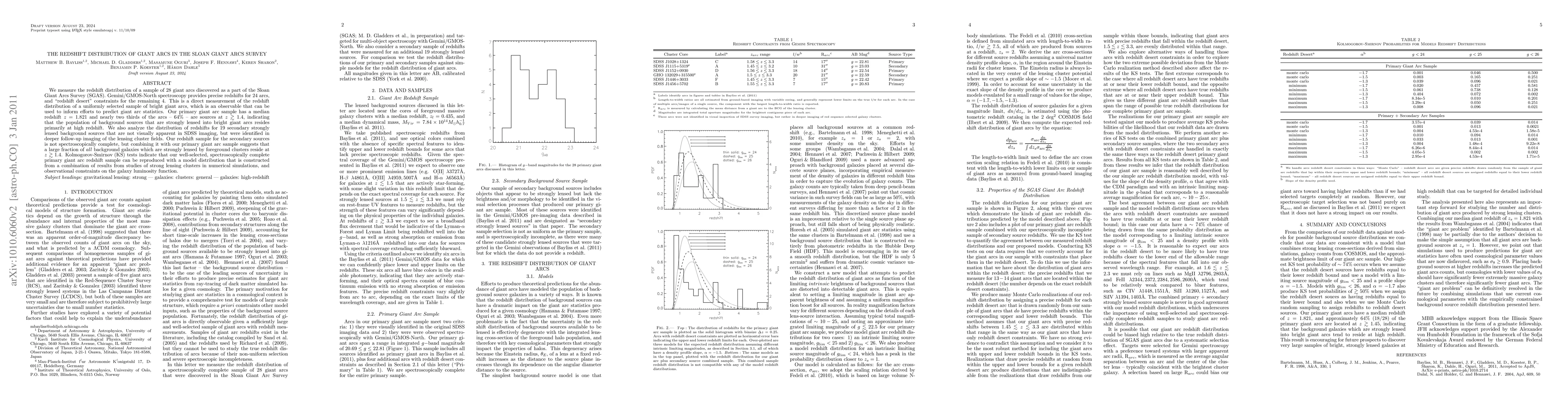 This study measures the redshift distribution of 28 giant arcs from the Sloan Giant Arcs Survey, finding a median redshift of z=1.821 with 64% at z \gtrsim 1.4. The analysis suggests that most strongly lensed background galaxies reside at high redshift, and a model combining simulation and observational data fits the primary arc sample well.