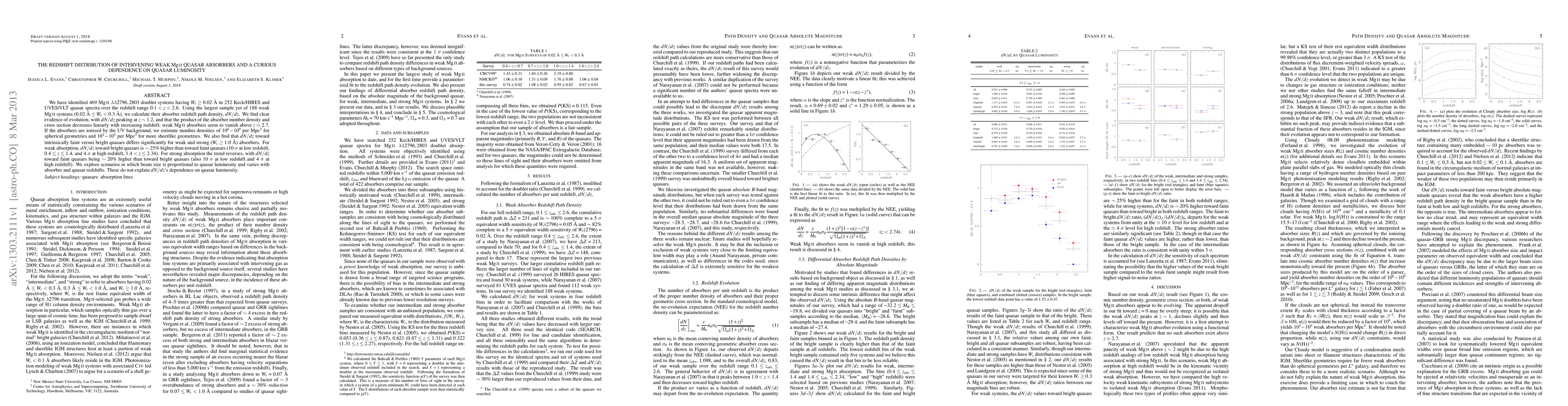 The study identified 469 MgII doublet systems with Wr >= 0.02 Å in 252 Keck/HIRES and UVES/VLT quasar spectra over the redshift range 0.1 < z < 2.6. They calculated the absorber redshift path density, dN/dz, for 188 weak MgII systems (0.02 Å <= Wr < 0.3 Å) and found evidence of evolution, peaking at z ~ 1.2.