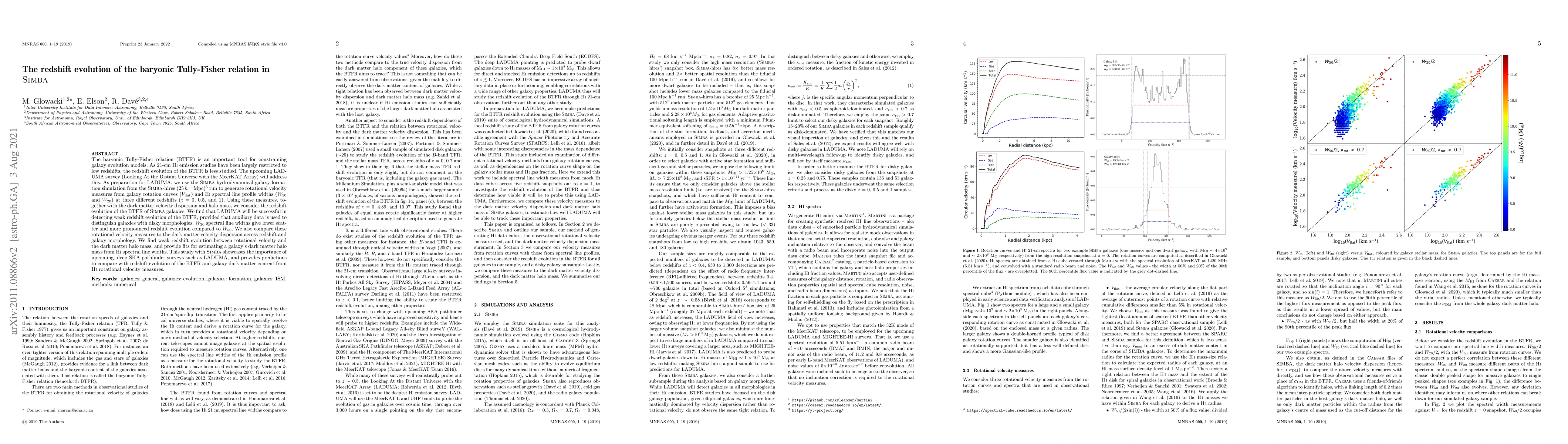 This paper investigates the redshift evolution of the baryonic Tully-Fisher relation (BTFR) using the Simba hydrodynamical galaxy formation simulation, predicting that the LADUMA survey will detect weak redshift evolution, especially with $W_{\rm 20}$ spectral line widths. It also finds a weak correlation between rotational velocity and dark matter halo mass across redshifts.