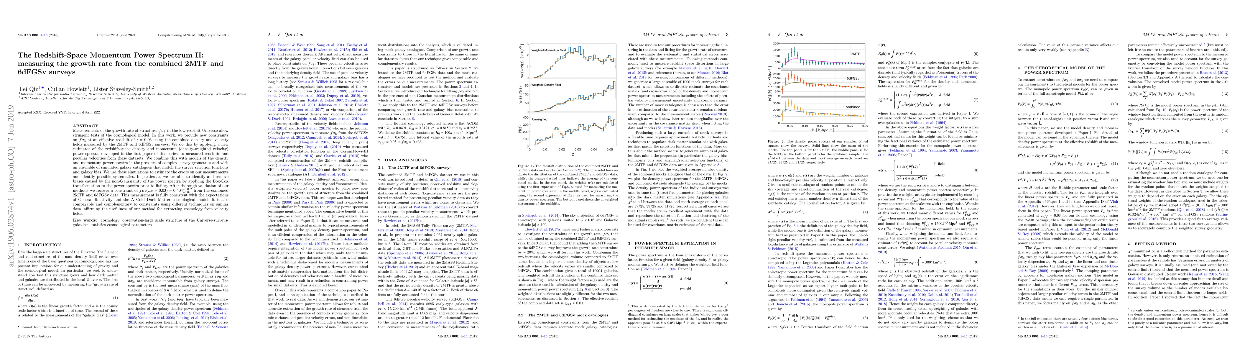 Measurements of the growth rate of structure, $f\sigma_8$ in the low-redshift Universe allow stringent tests of the cosmological model. In this work, we provide new constraints on $f\sigma_{8}$ at an effective redshift of $z=0.03$ using the combined density and velocity fields measured by the 2MTF and 6dFGSv surveys. We do this by applying a new estimator of the redshift-space density and momentum (density-weighted velocity) power spectra, developed in the first paper of this series, to measured redshifts and peculiar velocities from these datasets. We combine this with models of the density and momentum power spectra in the presence of complex survey geometries and with an ensemble of simulated galaxy catalogues that match the survey selection functions and galaxy bias. We use these simulations to estimate the errors on our measurements and identify possible systematics. In particular, we are able to identify and remove biases caused by the non-Gaussianity of the power spectra by applying the Box-Cox transformation to the power spectra prior to fitting. After thorough validation of our methods we recover a constraint of $f\sigma_8(z_{\mathrm{eff}}=0.03)=0.404^{+0.082}_{-0.081}$ from the combined 2MTF and 6dFGSv data. This measurement is fully consistent with the expectations of General Relativity and the $\Lambda$ Cold Dark Matter cosmological model. It is also comparable and complementary to constraints using different techniques on similar data, affirming the usefulness of our method for extracting cosmology from velocity fields.