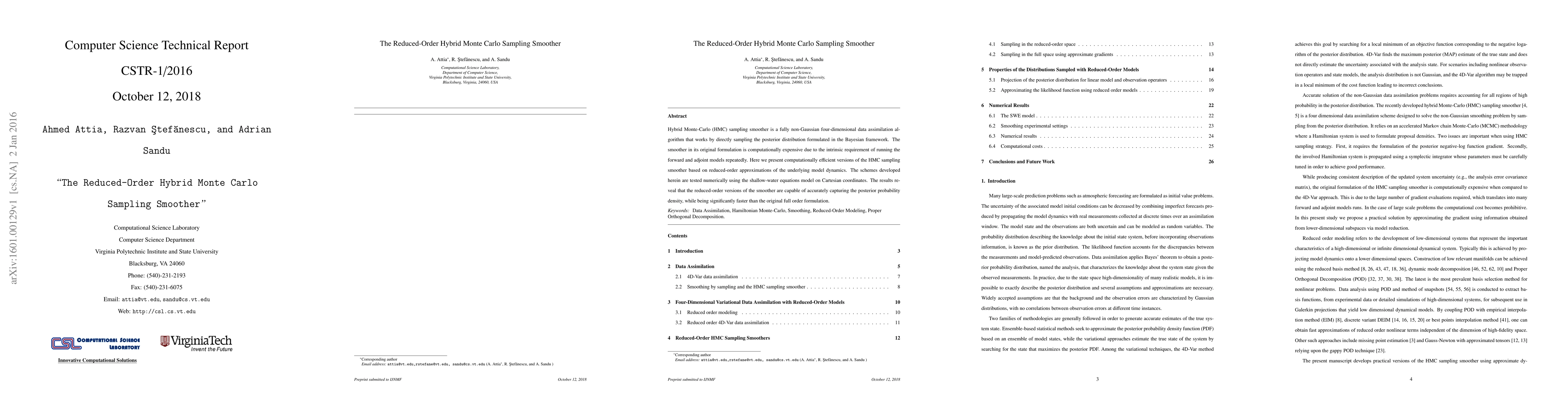 This paper presents computationally efficient versions of the Hybrid Monte-Carlo sampling smoother using reduced-order approximations, demonstrating their accuracy and speed compared to the original full-order formulation through numerical tests on the shallow-water equations model.