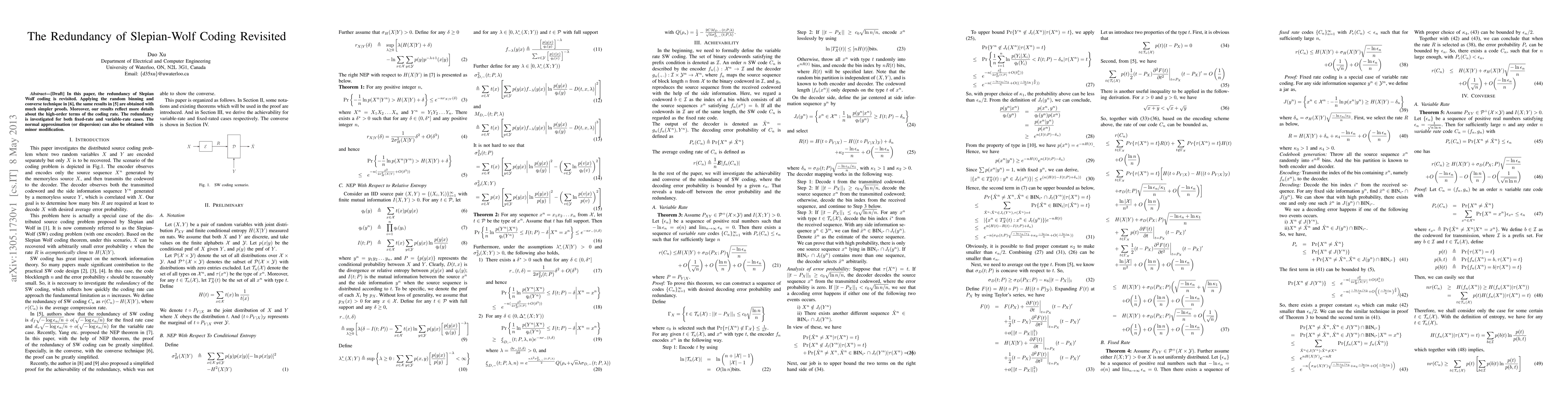 This paper revisits the redundancy of Slepian-Wolf coding, employing simpler proofs using random binning and converse techniques to achieve results similar to \cite{he}. It provides detailed insights into high-order terms of the coding rate and investigates redundancy for both fixed-rate and variable-rate scenarios.