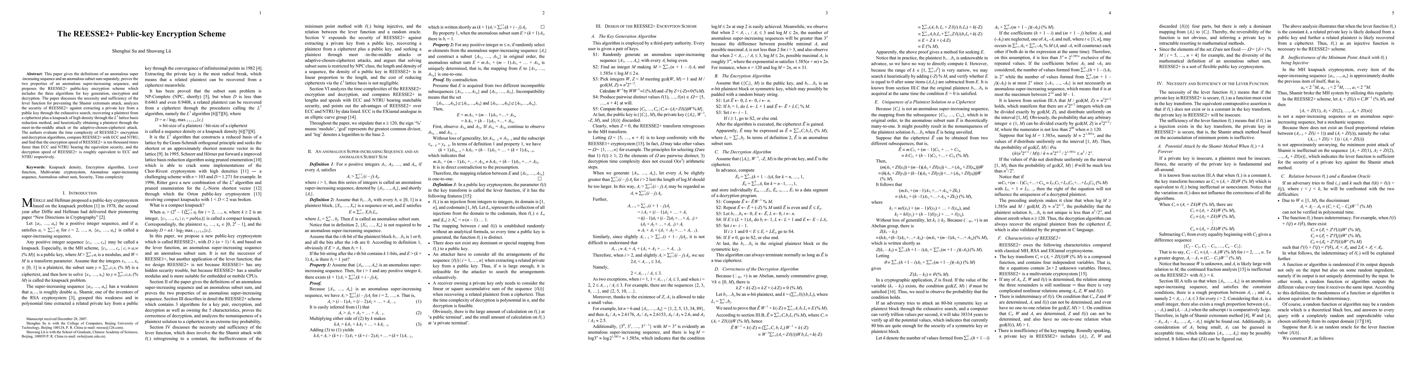 The paper defines anomalous super-increasing sequences and subset sums, proves their properties, and proposes the REESSE2+ public-key encryption scheme with key generation, encryption, and decryption algorithms.