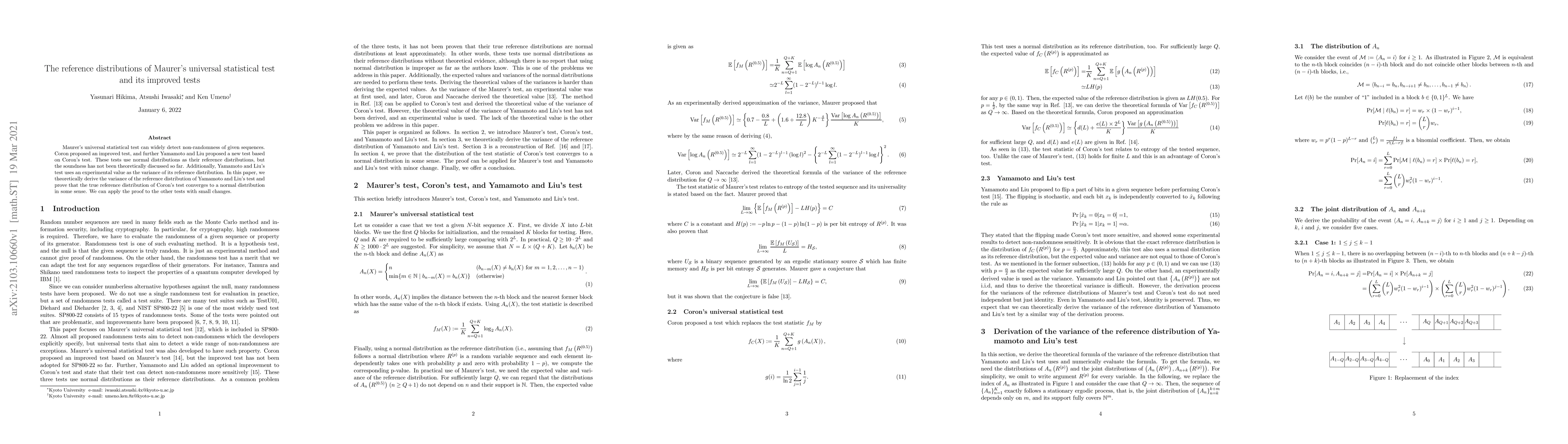 Maurer's universal statistical test can widely detect non-randomness of given sequences. Coron proposed an improved test, and further Yamamoto and Liu proposed a new test based on Coron's test. These tests use normal distributions as their reference distributions, but the soundness has not been theoretically discussed so far. Additionally, Yamamoto and Liu's test uses an experimental value as the variance of its reference distribution. In this paper, we theoretically derive the variance of the reference distribution of Yamamoto and Liu's test and prove that the true reference distribution of Coron's test converges to a normal distribution in some sense. We can apply the proof to the other tests with small changes.