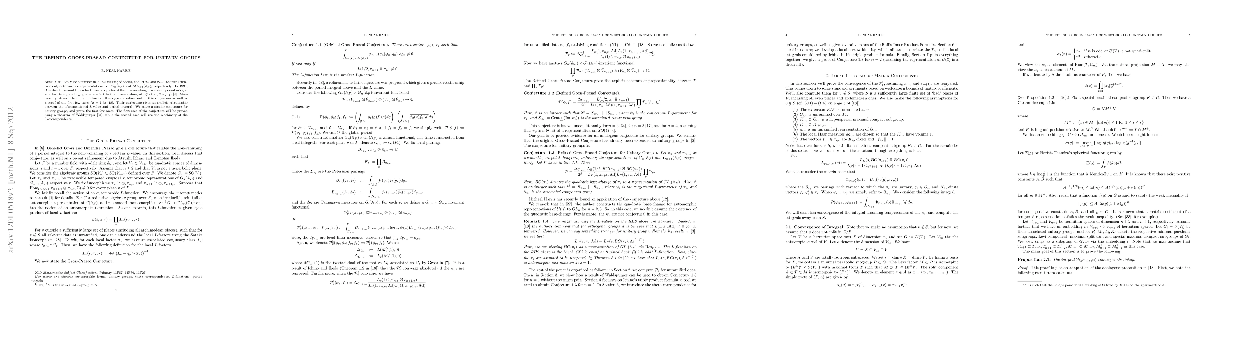 The paper refines the Gross-Prasad Conjecture for unitary groups, proposing a conjecture relating period integrals and L-values for these groups. The authors prove the conjecture for initial cases (n=2,3) using results from Waldspurger and the θ-correspondence.