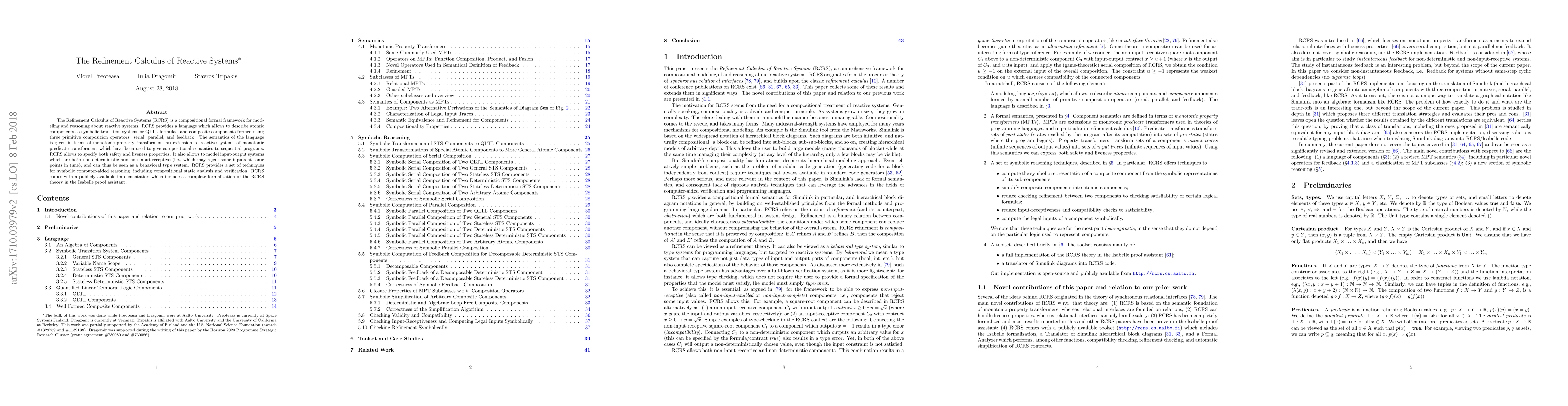 The Refinement Calculus of Reactive Systems (RCRS) offers a formal framework for modeling and reasoning about reactive systems using compositional techniques, enabling specification of safety and liveness properties and supporting non-deterministic, non-input-receptive input-output systems. It includes an implementation in Isabelle for symbolic reasoning and verification.