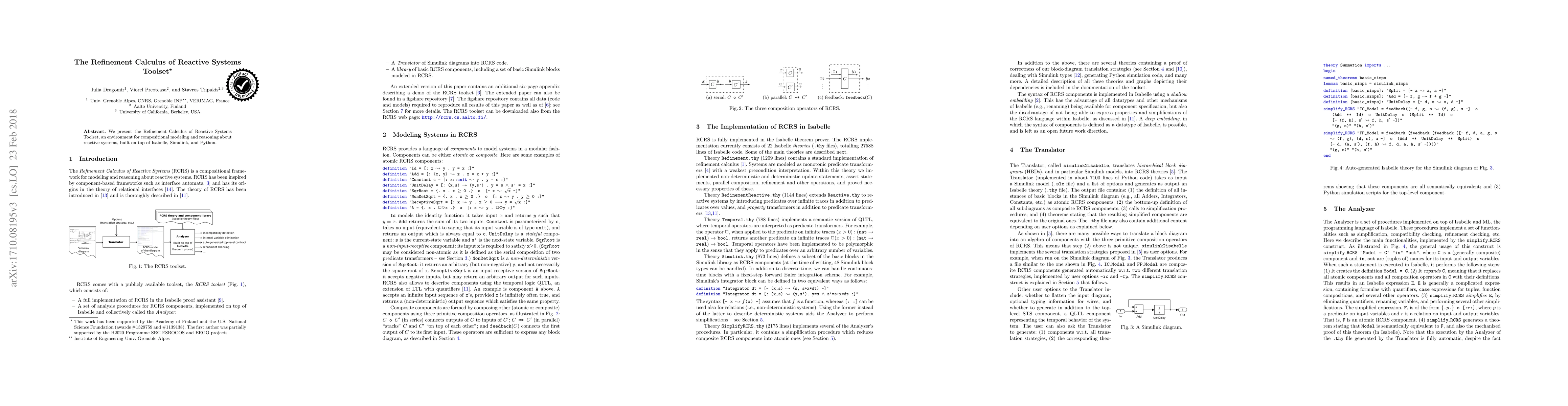 Summary: The Refinement Calculus of Reactive Systems Toolset provides a compositional modeling and reasoning framework for reactive systems, leveraging the capabilities of Isabelle, Simulink, and Python to facilitate complex system analysis.
